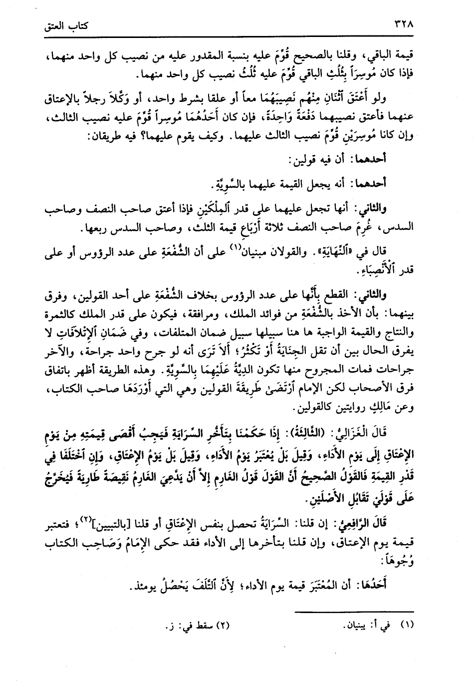 والثاني: القطع بأَنَّها على عدد الرؤوس بخلاف الشُّفْعَةِ على أحد القولين، وفرق بينهما: بأن الأخذ بالشُّفْعَةِ من فوائد الملك، ومرافقة، فيكون على قدر الملك كالثمرة والنتاج والقيمة الواجبة هاهنا سبيلها سبيل ضمان المتلفات، وفي ضَمَانِ الإِتْلافَاتِ لا يفرق الحال بين أن تقل الجِنَايَةُ أَوْ تَكْثُرُ؛ أَلاَ تَرَى أنه لو جرح واحد جراحة، والآخر جراحات فمات المجروح منها تكون الدِيَّةُ عَلَيْهِمَا بِالسَّوِيَّةِ. وهذه الطريقة أظهر باتفاق فرق الأصحاب لكن الإِمام ارْتَضَى طَرِيقَةَ القولين وهي التي أَوْرَدَهَا صاحب الكتاب، وعن مالك روايتين كالقولين.