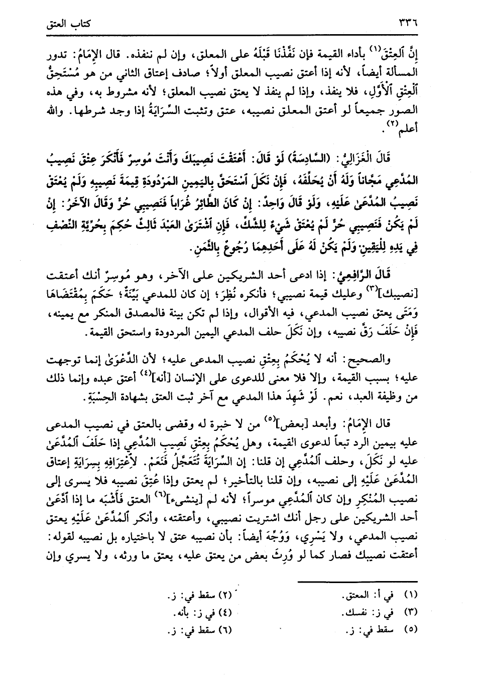 قَالَ الْغَزَالِيُّ: (السَّادِسَةُ) لَوْ قَالَ: أَعْتَقْتَ نَصِيبَكَ وَأَنْتَ مُوسِرٌ فَأَنْكَرَ عِتْقَ نَصِيبُ المُدَّعِي مَجَّاناً وَلَهُ أن يُحَلِّفَهُ، فَإِنْ نَكَلَ اسْتَحَقَّ باليَمِيْنِ المَرْدُودَةِ قِيمَةَ نَصِيبِهِ وَلَمْ يُعْتَقْ نَصِيبُ المُدَّعَى عَلَيْهِ، وَلَوْ قَالَ وَاحِدٌ: إِنْ كَانَ الطَّائِرُ غُرَاباً فَنَصِيبِي حُرٌّ وَقَالَ الآخَرُ: إِنْ لَمْ يَكُنْ فَنَصِيبِي حُرٌّ لَمْ يُعْتَق شَيْءٌ لِلشَّكِّ، فَإِنِ اشْتَرَى العَبْدَ ثَالِثٌ حُكِمَ بِحُرِّيَّةِ النِّصْفِ فِي يَدِهِ لِلْيَقِين وَلَمْ يَكن لَهُ عَلَى أَحَدِهِمَا رُجُوعٌ بِالثَّمَنِ.