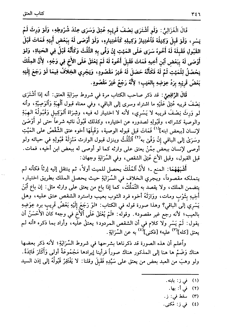 قَالَ الْغَزَالِيُّ: وَلَوِ اشْتَرَى نِصْفَ قَرِيْبِهِ عُتِقَ وَسَرَى عِنْدَ شُرُوطِهِ، وَلَوْ وَرِثَ لَمْ يَسْرِ، وَلَوْ قَبِلَ وَكِيْلُهُ فَاخْتِيَارُ وَكِيلِهِ كَاخْتِيَارِهِ، وَلَوْ أَوْصَى لَهُ بِبَعْضِ أَبِيْهِ فَمَاتَ قَبْلَ القَبُولِ فَقَبِلَهُ لَهُ أَخُوهُ سَرَى عَلَى المَيِّتِ إِنْ وَفَّى بِهِ الثُّلُثَ وَكَأَنَّهُ قَبْلُ فِي الحَيَاةِ، وَلوْ أَوْصَى لَهُ بِبَعْضِ ابْنِ أَخِيهِ فَمَاتَ فَقَبِلَ أَخُوهُ لَهُ لَمْ يُعْتَقْ عَلَى الأَخِ فِي وَجْهٍ، لِأَنَّ المِلْكَ يَحْصُلُ لِلْمَيِّتِ ثُمَّ لَهُ فَكَأَنَّهُ حَصَلَ لَهُ غَيْرُ مَقْصُودٍ، وَيَجْرِي الخِلاَفُ فِيمَا لَوْ رَجَعَ إِلَيْهِ بَعْضُ قَرِيْبِهِ بِرَدِّ عِوَضِهِ بِالعَيْبِ؛ لِأَنَّهُ رَجْعٌ غَيْرُ مَقْصُودٍ.