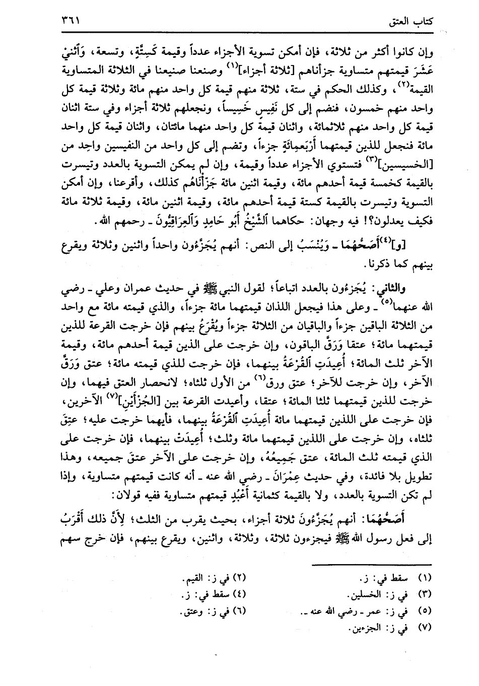 والثاني: يُجَزءُون بالعدد اتباعاً؛ لقول النبي -صلى الله عليه وسلم- في حديث عمران وعلي -رضي الله عنهما (¬5) - وعلى هذا فيجعل اللذان قيمتهما مائة جزءاً، والذي قيمته مائة مع واحد من الثلاثة الباقين جزءاً والباقيان من الثلاثة جزءاً ويُقْرَعُ بينهم فإن خرجت القرعة للذين قيمتهما مائة؛ عتقا وَرَقَّ الباقون، وإن خرجت على الدين قيمة أحدهم مائة، وقيمة الآخر ثلث المائة؛ أُعِيدَتِ القُرْعَةُ بينهما، فإن خرجت للذي قيمته مائة؛ عتق وَرَقَّ الآخر، وإن خرجت للآخر؛ عتق ورق (¬6) من الأول ثلثاه؛ لانحصار العتق فيهما، وإن خرجت للذين قيمتهما ثلثا المائة؛ عتقا، وأعيدت القرعة بين [الجُزْأَيْنِ] (¬7) الآخرين، فإن خرجت على اللذين قيمتهما مائة أُعِيدَتِ القُرْعَةُ بينهما، فأيهما خرجت عليه؛ عتِقَ ثلثاه، وإن خرجت على اللذين قيمتهما مائة وثلث؛ أُعِيدَتْ بينهما، فإن خرجت على الذي قيمته ثلث المائة، عتق جَمِيعُهُ، وإن خرجت على الآخر عتقَ جميعه، وهذا تطويل بلا فائدة، وفي حديث عِمْرَانَ -رضي الله عنه- أنه كانت قيمتهم متساوية، وإذا لم تكن التسوية بالعدد، ولا بالقيمة كثمانية أَعْبُدٍ قيمتهم متساوية ففيه قولان: