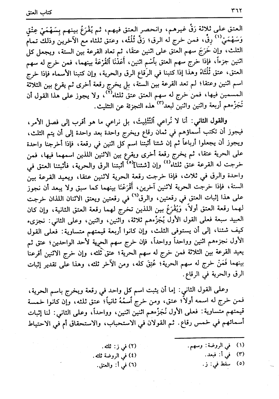 والقول الثاني: أنا لا نُراعي التَّثْلِيثَ، بل نراعي ما هو أقرب إلى فصل الأمر، فيجوز أن تكتب أسماؤهم في ثمان رقاع ويخرج واحدة بعد واحدة إلى أن يتم الثلث، ويجوز أن يجعلوا أرباعاً ثم إن شئنا أثبتنا اسم كل اثنين في رقعة، فإذا أخرجنا واحدة على الحرية عتقا، ثم يخرج رقعة أخرى ويقرع بين الاثنين اللذين اسمهما فيها، فمن خرجت له القرعة عتق ثلثاه (¬4) وإن [شئنا] (¬5) أثبتنا الرق والحرية، فأثبتنا العتق في واحدة والرق في ثلاث، فإذا خرجت رقعة الحرية لاثنين عتقا، ويعيد القرعة بين الستة، فإذا خرجت الحرية لاثنين آخرين، أَقْرَعْنَا بينهما كما سبق ولا يبعد أن نجوز على هذا إثبات العتق في رقعتين، والرق (¬6) في رقعتين ويعتق الاثنان اللذان خرجت لهما رقعة العتق أولاً، وَيُقْرَعُ بين اللذين تخرج لهما رقعة العتق الثانية، وإن كان العبيد سبعة فعلى القول الأول يُجَزِّءهم ثلاثة، واثنين، واثنين، وعلى الثاني: نجزئ كيف شئنا، إلى أن يستوفى الثلث، وإن كانوا أربعة قيمتهم متساوية: فعلى القول الأول نجزءهم اثنين وواحداً وواحداً، فإن خرج سهم الحرية لأحد الواحدين؛ عتق ثم يعيد القرعة بين الثلاثة فمن خرج له سهم الحرية؛ عتق ثلثه، وإن خرج الاثنين أقرعنا بينهما فَمَنْ خرج له سهم الحرية؛ عُتِقَ كله، ومن الآخر ثلثه، وهذا على تقدير إثبات الرق والحرية في الرقاع.