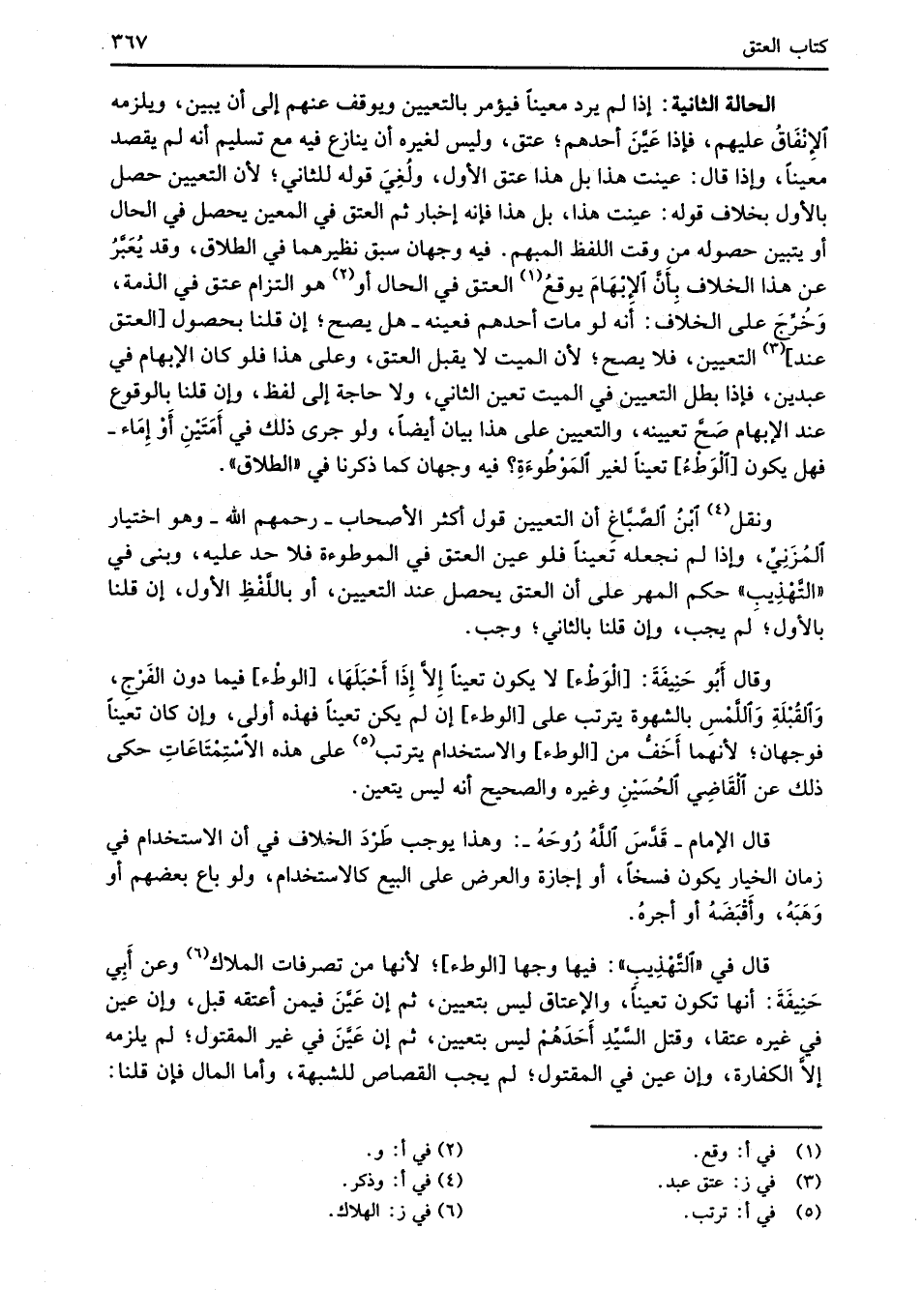قال في "التَّهْذِيبِ": فيها وجهاً [الوطء]؛ لأنها من تصرفات الملاك (¬6) وعن أَبِي حَنِيْفَةَ: أنَّها تكون تعيناً، والإعتاق ليس بتعيين، ثم إن عَيَّنَ فيمن أعتقه قبل، وإن عين في غيره عتقا، وقتل السَّيِّدِ أَحَدَهُمْ ليس بتعيين، ثم إن عَيَّنَ في غير المقتول؛ لم يلزمه إلاَّ الكفارة، وإن عين في المقتول؛ لم يجب القصاص للشبهة، وأما المال فإن قلنا: