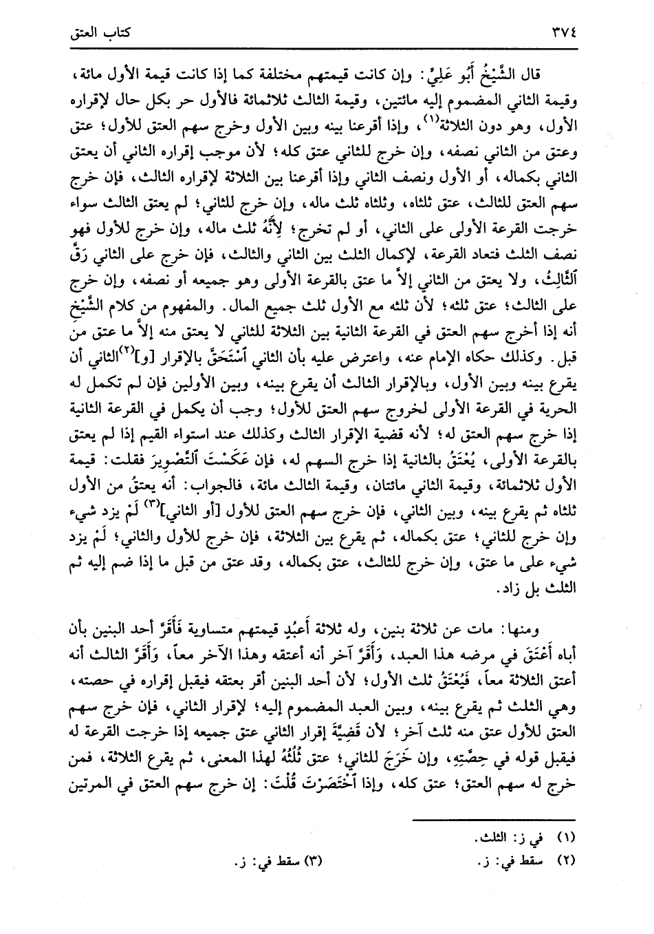 قال الشَّيْخُ أبو عَلِيٍّ: وإن كانت قيمتهم مختلفة كما إذا كانت قيمة الأول مائة، وقيمة الثاني المضموم إليه مائتين، وقيمة الثالث ثلاثمائة فالأول حر بكل حال لإقراره الأول، وهو دون الثلاثة (¬1)، وإذا أقرعنا بينه وبين الأول وخرج سهم العتق للأول؛ عتق وعتق من الثاني نصفه، وإن خرج للثاني عتق كله؛ لأن موجب إقراره الثاني أن يعتق الثاني بكماله، أو الأول ونصف الثاني وإذا أقرعنا بين الثلاثة لإقراره الثالث، فإن خرج سهم العتق للثالث، عتق ثلثاه، وثلثاه ثلث ماله، وإن خرج للثاني؛ لم يعتق الثالث سواء خرجت القرعة الأولى على الثاني، أو لم تخرج؛ لِأَنَّهُ ثلث ماله، وإن خرج للأول فهو نصف الثلث فتعاد القرعة، لإكمال الثلث بين الثاني والثالث، فإن خرج على الثاني رَقَّ الثَّالِثُ، ولا يعتق من الثاني إلاَّ ما عتق بالقرعة الأولى وهو جميعه أو نصفه، وإن خرج على الثالث؛ عتق ثلثه؛ لأن ثلثه مع الأول ثلث جميع المال. والمفهوم من كلام الشَّيْخِ أنه إذا أخرج سهم العتق في القرعة الثانية بين الثلاثة للثاني لا يعتق منه إلاَّ ما عتق من قبل. وكذلك حكاه الإِمام عنه، واعترض عليه بأن الثاني اسْتَحَقَّ بالإقرار [و] (¬2) الثاني أن يقرع بينه وبين الأول، وبالإقرار الثالث أن يقرع بينه، وبين الأولين فإن لم تكمل له الحرية في القرعة الأولى لخروج سهم العتق للأول؛ وجب أن يكمل في القرعة الثانية إذا خرج سهم العتق له؛ لأنه قضية الإقرار الثالث وكذلك عند استواء القيم إذا لم يعتق بالقرعة الأولى، يُعْتَقُ بالثانية إذا خرج السهم له، فإن عَكَسْتَ التَّصْوِيرَ فقلت: قيمة الأول ثلاثمائة، وقيمة الثاني مائتان، وقيمة الثالث مائة، فالجواب: أنه يعتق من الأول ثلثاه ثم يقرع بينه، وبين الثاني، فإن خرج سهم العتق للأول [أو الثاني] (¬3) لَمْ يزد شيء وإن خرج للثاني؛ عتق بكماله، ثم يقرع بين الثلاثة، فإن خرج للأول والثاني؛ لَمْ يزد شيء على ما عتق، وإن خرج للثالث، عتق بكماله، وقد عتق من قبل ما إذا ضم إليه ثم الثلث بل زاد.