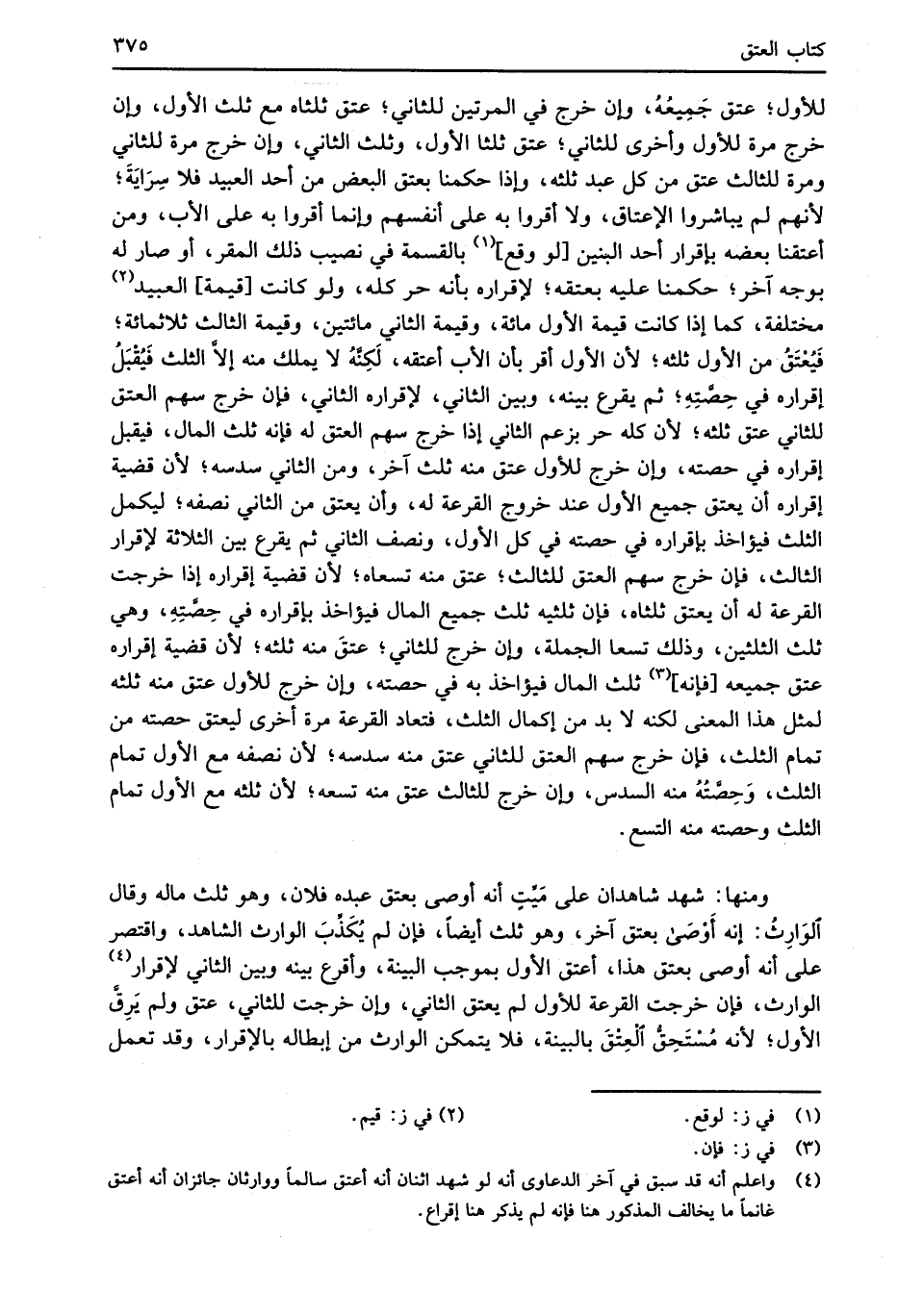 (¬4) واعلم أنه قد سبق في آخر الدعاوى أنه لو شهد اثنان أنه أعتق سالماً ووارثان جائزان أنه أعتق غانماً ما يخالف المذكور هنا فإنه لم يذكر هنا إقراع.