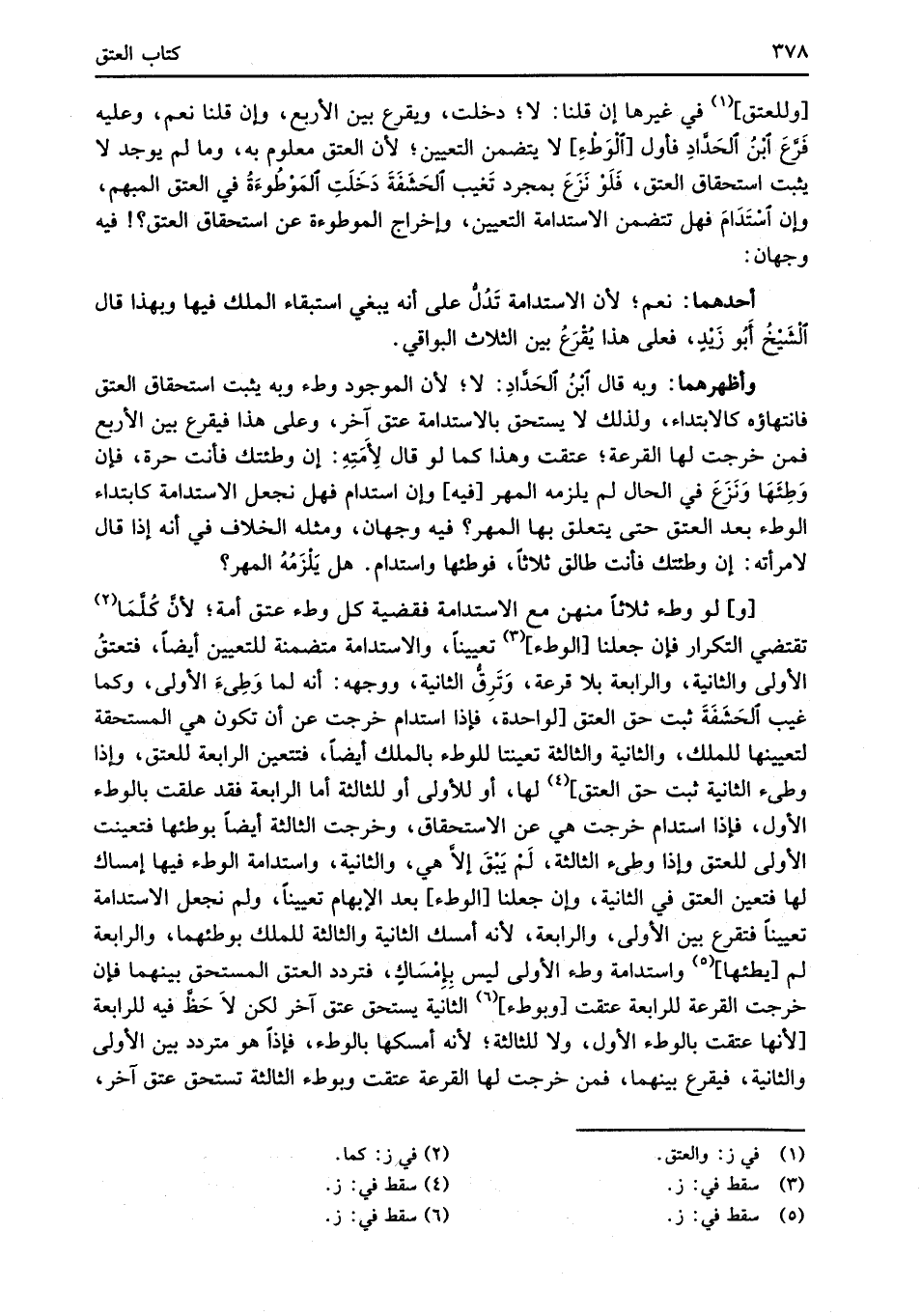 [وللعتق] (¬1) في غيرها إن قلنا: لا؛ دخلت، ويقرع بين الأربع، وإن قلنا نعم، وعليه فَرَّعَ ابْنُ الحَدَّادِ فأول [الْوَطْءِ] لا يتضمن التعيين؛ لأن العتق معلوم به، وما لم يوجد لا يثبت استحقاق العتق، فَلَوْ نَزَعَ بمجرد تَغْيب الحَشَفَةَ دَخَلَتِ المَوْطُوءَةُ في العتق المبهم، وإن اسْتَدَامَ فهل تتضمن الاستدامة التعيين، وإخراج الموطوءة عن استحقاق العتق؟! فيه وجهان: