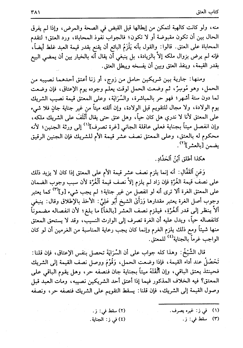 وَعَنِ القَفَّالِ: أنه إنما يلزم نصف عشر قيمة الأم على المعتتى إذا كان لا يزيد ذلك على نصف قيمة الغُرَّةِ فإن زاد لم يلزم إلاَّ نصف قيمة الْغُرَّة لأن سبب وجوب الضمان على المعتق الغرة ألا ترى أنه لو انفصل من غيْرِ جناية؛ لم يجب شيء [و] (¬3) كما يعتبر وجوب أصل الغرة يعتبر مقدارها وَرَأَى الشيخ أَبُو عَلِيٍّ: الأخذ بالإطلاق وقال: ينبغي ألاَّ ينظر إلى قدر الغُرَّةِ، فيلزم نصف العشر [بالغاً] ما بلغ؛ لأن انفصاله مضموناً كانفصاله حياً، ويدل عليه أن الغرة تصرف إلى الوارث النسيب، وقد لا يستحق المعتق منها شيئاً وسع ذلك يلزم الغرم وإنما كان يجب رعاية المناسبة من الغرمين أن لو كان الواجب غرماً بالجناية (¬4) للمعتق.