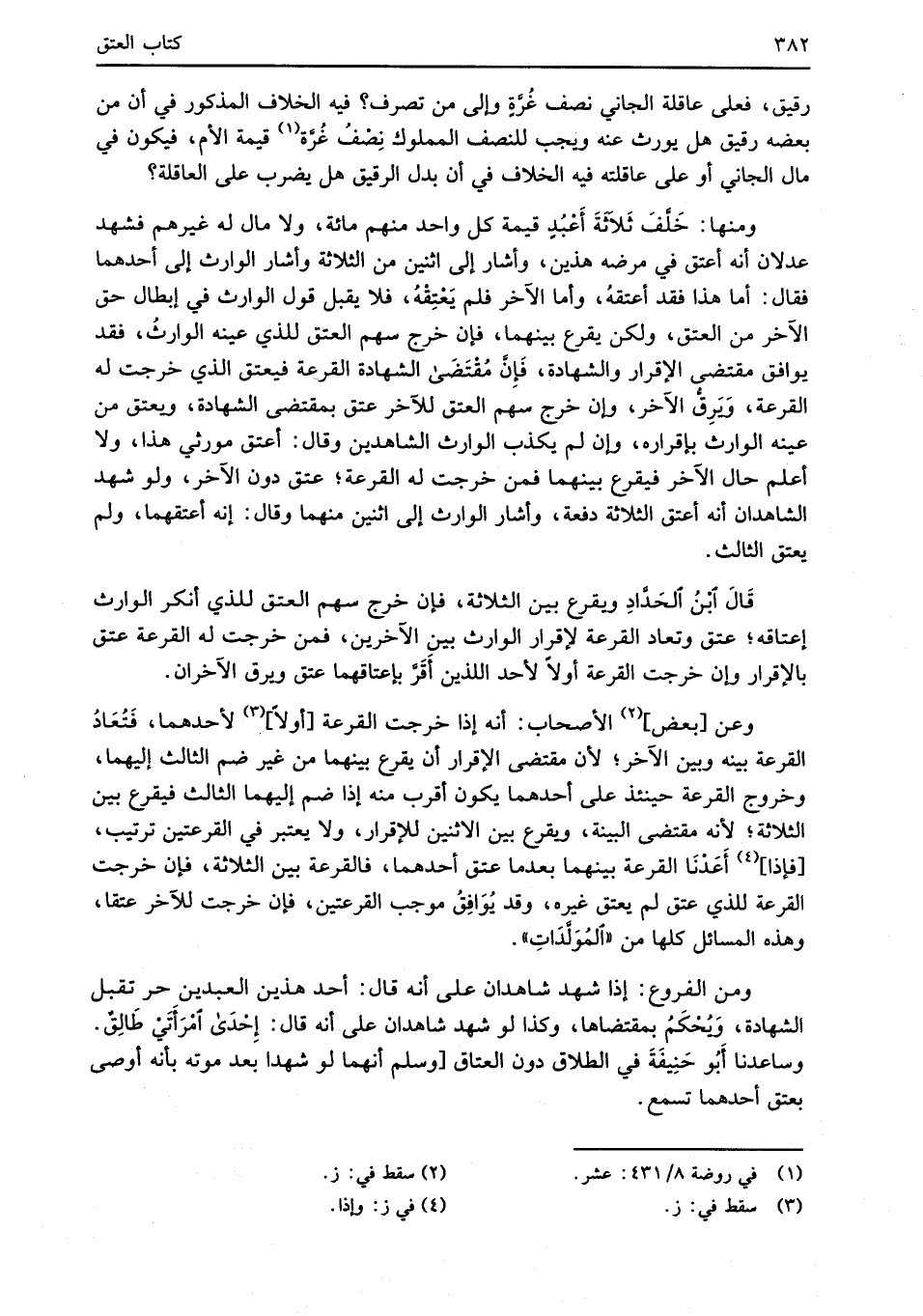 ومنها: خَلَّفَ ثَلاثةَ أَعْبُدٍ قيمة كل واحد منهم مائة، ولا مال له غيرهم فشهد عدلان أنه أعتق في مرضه هذين، وأشار إلى اثنين من الثلاثة وأشار الوارث إلى أحدهما فقال: أما هذا فقد أعتقهُ، وأما الآخر فلم يَعْتِقْهُ، فلا يقبل قول الوارث في إبطال حق الآخر من العتق، ولكن يقرع بينهما، فإن خرج سهم العتق للذي عينه الوارثُ، فقد يوافق مقتضى الإقرار والشهادة، فَإِنَّ مُقْتَضَى الشهادة القرعة فيعتق الذي خرجت له القرعة، وَيرِقُّ الآخر، وإن خرج سهم العتق للآخر عتق بمقتضى الشهادة، ويعتق من عينه الوارث بإقراره، وإن لم يكذب الوارث الشاهدين وقال: أعتق مورثي هذا, ولا أعلم حال الآخر فيقرع بينهما فمن خرجت له القرعة؛ عتق دون الآخر، ولو شهد الشاهدان أنه أعتق الثلاثة دفعة، وأشار الوارث إلى اثنين منهما وقال: إنه أعتقهما, ولم يعتق الثالث.