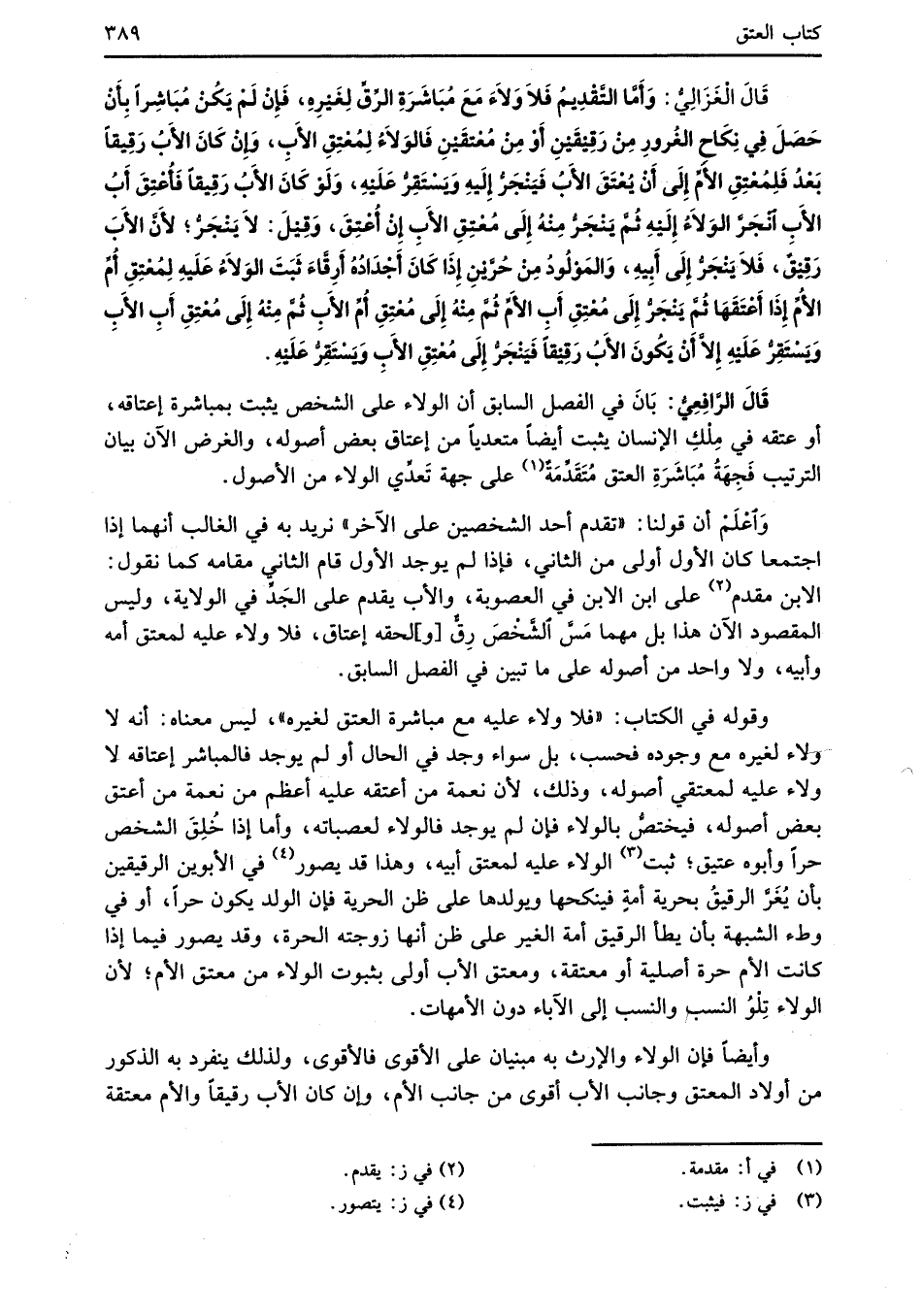 قَالَ الْغَزَالِيُّ: وَأَمَّا التَّقْدِيمُ فَلاَ وَلاَءَ مَعَ مُبَاشَرَةِ الرِّقِّ لِغَيْرِهِ، فَإنْ لَمْ يَكُنْ مُبَاشِراً بِأَنْ حَصَلَ فِي نِكَاحِ الغُرورِ مِنْ رَقِيْقَيْنِ أَوْ مِنْ مُعْتقَيْنِ فَالوَلاَءُ لِمُعْتِقِ الأَبِ، وَإِنْ كَانَ الأَبُ رَقِيقاً بَعْدُ فَلِمُعْتِقِ الأَمِّ إِلَى أَنْ يُعْتَقَ الأَبُ فَيَنْجَرُّ إِلَيْهِ وَيَسْتَقِرُّ عَلَيْهِ، وَلَوْ كَانَ الأَبُ رَقِيقاً فَأُعْتِقَ أَبُ الأَبِ انْجَرَّ الوَلاَءُ إِلَيْهِ ثُمَّ يَنْجَرُّ مِنْهُ إِلَى مُعْتِقِ الأَبِ إِنْ أُعْتِقَ، وَقِيْلَ: لاَ يَنْجَرُّ؛ لأَنَّ الأَبَ رَقِيْقٌ، فَلاَ يَنْجَرُّ إِلَى أَبِيهِ، وَالمَوْلُودُ مِنْ حُرَّيْنِ إِذَا كَانَ أَجْدَادُهُ أَرِقَّاءَ ثَبَتَ الوَلاَءُ عَلَيْهِ لِمُعْتِقِ أمِّ الأُمِّ إِذَا أَعْتَقَهَا ثمَّ يَنْجَرُّ إِلَى مُعْتِقِ أَبِ الأمِّ ثُمَّ مِنْهُ إِلَى مُعْتِقِ أُمِّ الأَبِ ثُمَّ مِنْهُ إِلَى مُعْتِقِ أَبِ الأَبِ وَيَسْتَتَقِرُّ عَلَيْهِ إِلاَّ أَنْ يَكُونَ الأَبُ رَقِيْقاً فَيَنْجَرُّ إِلَى مُعْتِقِ الأَبِ وَيَسْتَتَقِرُّ عَلَيْهِ.