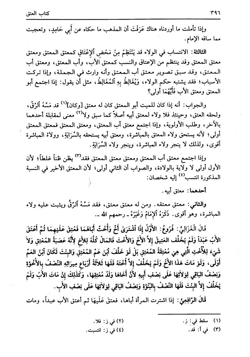قَالَ الْغَزَالِيُّ: فُرُوعٌ: الأَوَّلُ إِذَا اشْتَرَى أَخٌ وَأُخْتٌ أَبَاهُمَا فَعُتِقَ عَلَيْهِمَا ثُمَّ أَعْتَقَ الأَبُ عَبْدَاً وَلَمْ يُخَلِّف العَتِيقُ إِلاَّ الأَخَ وَالأُخْتَ فَالمَالُ كُلُّهُ لِلأخِ لِأَنَّهُ عَصَبَةُ المُعْتِقِ وَلاَ شَيْءَ لِلأخْتِ الَّتِي هِيَ مُعْتِقَةُ المُعْتِقِ بَلْ لَوْ خَلَّفَ ابْنَ عَمِّ المُعْتِقِ وَالبِنْتَ لَكَانَ ابْنُ العَمِّ أَوْلَى، وَلَوْ مَاتَ هَذَا الأَخُ وَلَمْ يُخَلِّفْ إِلاَّ أُخْتَهُ فَلَهَا ثَلاَثَةُ أَرْبَاعِ مِيرَاثِهِ النِّصْفُ بِالأُخُوَّةِ وَنصْفُ البَاقِي لِوَلاَئِهَا عَلَى نِصْفِ أَبِيهِ لأَنَّ أَخَاهَا وَلَدُ مُعْتِقِهَا، وَكَذَلِكَ إِنْ مَاتَ الأَبُ وَلَمْ يُخَلِّفْ إِلاَّ البِنْتَ فَلَهَا النِّصْفُ بِالبُنُوَّةِ وَنِصْفُ البَاقِي لِوَلاَئِهَا عَلَى نِصْفِ الأَبِ.