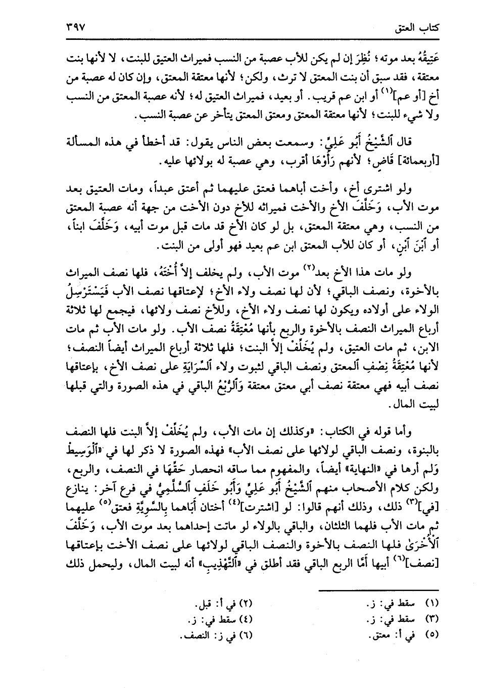 قال الشَّيْخُ أَبُو عَلِيٍّ: وسمعت بعض الناس يقول: قد أخطأ في هذه المسألة [أربعمائة] قَاضٍ؛ لأنهم رَأَوْهَا أقرب، وهي عصبة له بولائها عليه.