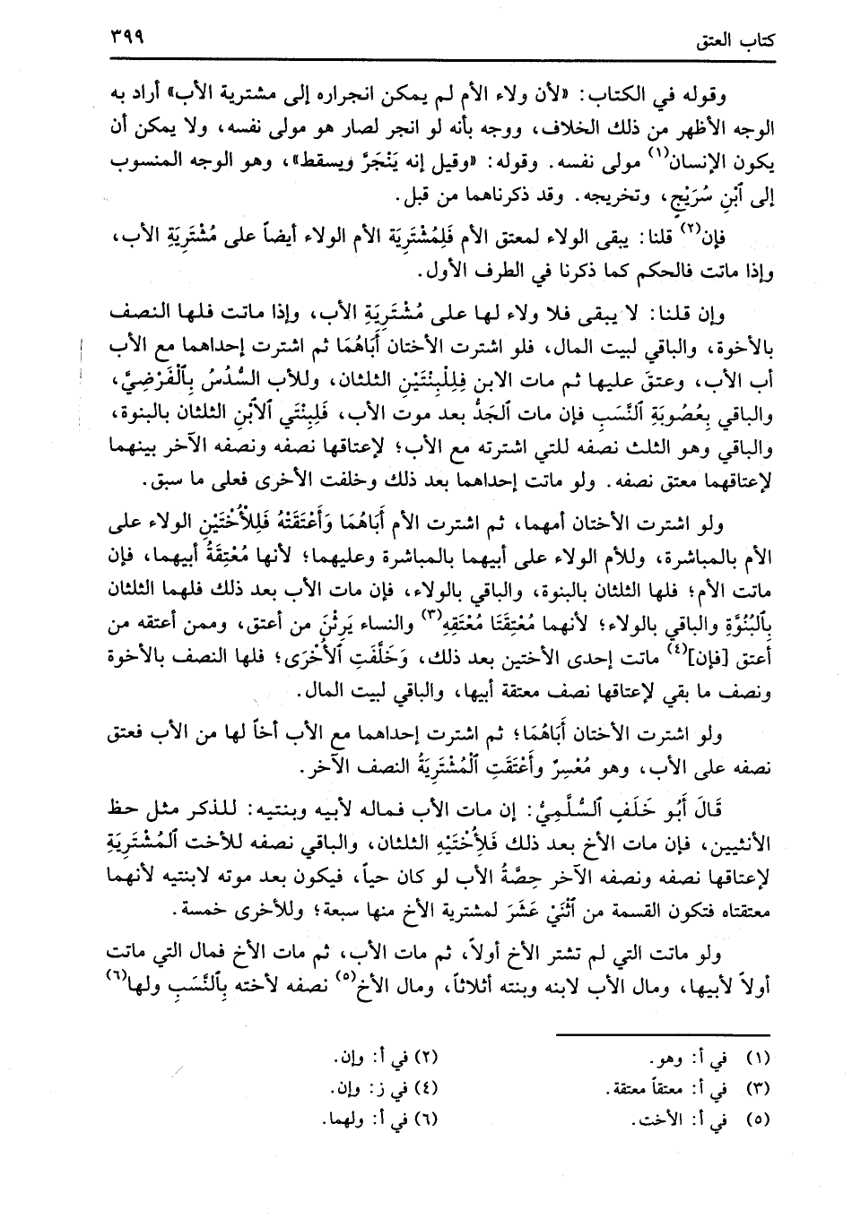 قَالَ أَبُو خَلَفٍ السُّلَّمِيُّ: إن مات الأب فماله لأبيه وبنتيه: للذكر مثل حظ الأنثيين، فإن مات الأخ بعد ذلك فَلأُخْتَيهِ الثلثان، والباقي نصفه للأخت المُشْتَرِيَةِ لإعتاقها نصفه ونصفه الآخر حِصَّةُ الأب لو كان حياً، فيكون بعد موته لابنتيه لأنهما معتقتاه فتكون القسمة من اثْنَيْ عَشَرَ لمشترية الأخ منها سبعة؛ وللأخرى خمسة.