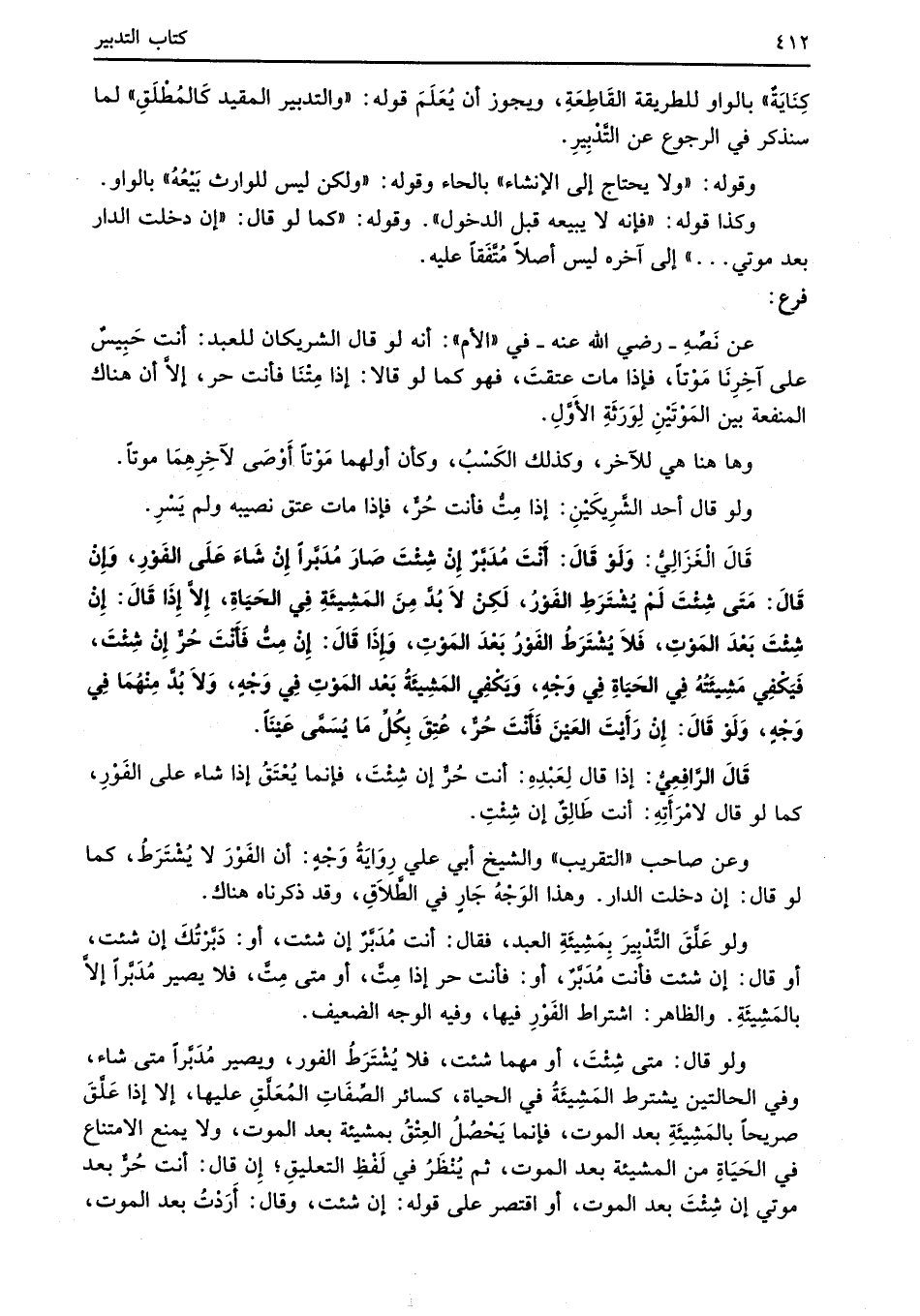 كِنَايَةٌ" بالواو للطريقة القَاطِعَةِ، ويجوز أن يُعَلَمَ قوله: "والتدبير المقيد كَالمُطْلَقِ" لما سنذكر في الرجوع عن التَّدْبِيرِ.