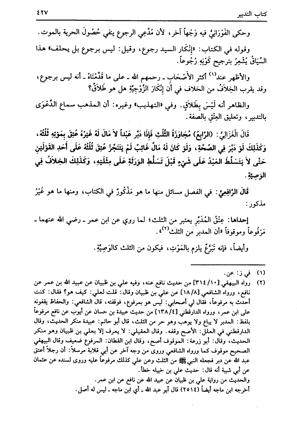 (¬2) رواه البيهقي [10/ 314] من حديث نافع عنه، وفيه علي بن ظبيان عن عبيد الله بن عمر عن نافع، ورواه الشافعي [8/ 18] عن علي بن ظبيان وقال: قلت لعلي: كيف هو؟ فقال: كنت أحدث به مرفوعاً، فقال لي أصحابي: ليس هو بمرفوع، فوقفته، قال الشافعي: والحفاظ يقفونه على ابن عمر، ورواه الدارقطني [4/ 138] من حديث عبيدة بن حسان عن أيوب عن نافع مرفوعاً بلفظ: المدبر لا يباع ولا يوهب وهو حر من الثلث، قال أبو حاتم: عبيدة منكر الحديث، وقال الدارقطني في العلل: الأصح وقفه. وقال العقيلي: لا يعرف إلا بعلي بن ظبيان وهو منكر الحديث، وقال: أبو زرعة: الموقوف أصح، وقال ابن القطان: المرفوع ضعيف وقال البيهقي الصحيح موقوف كما ورواه الشافعي وروى من وجه آخر عن أبي قلابة مرسلاً: أن رجلاً أعتق عبد الله عن دبر فجعله النبي -صلى الله عليه وسلم- من الثلث وعن علي كذلك مرفوعاً عليه وروى لسنده عن عثمان عن أبي شيبة أنه قال: حديث علي بن خييله خطأ.