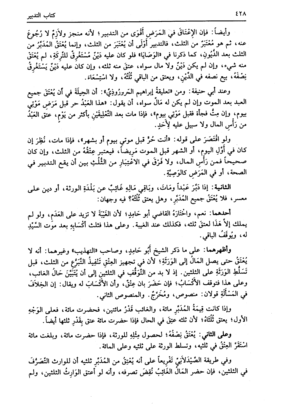 وأيضاً: فإن الإعْتَاقَ في المَرَضِ أَقْوَى من التدبير؛ لأنه منجز ولاَزِمٌ لا رُجُوعَ عنه، ثم هو مُعْتَبَرٌ من الثلث، فالتدبير أَوْلَى أن يُعْتَبَرَ من الثلث، وإنما يُعْتَقُ المُدَبَّرُ من الثلث بعد الدُّيُونِ، كما ذكرنا في "الوَصَايَا" فلو كان عليه دَيْنٌ مُسْتَغْرِقٌ للتَّرِكَةِ، لم يُعْتَقْ منه شيء، وإن لم يكن دَيْنٌ ولا مال سواه، عتقَ منه ثلثه، وإن كان عليه دَيْنٌ يَسْتَغْرِقُ نِصْفَهُ، بيع نصفه في الدَّيْنِ، ويعتق من الباقي ثُلُثُهُ، ولا اسْتِسْعَاءَ.