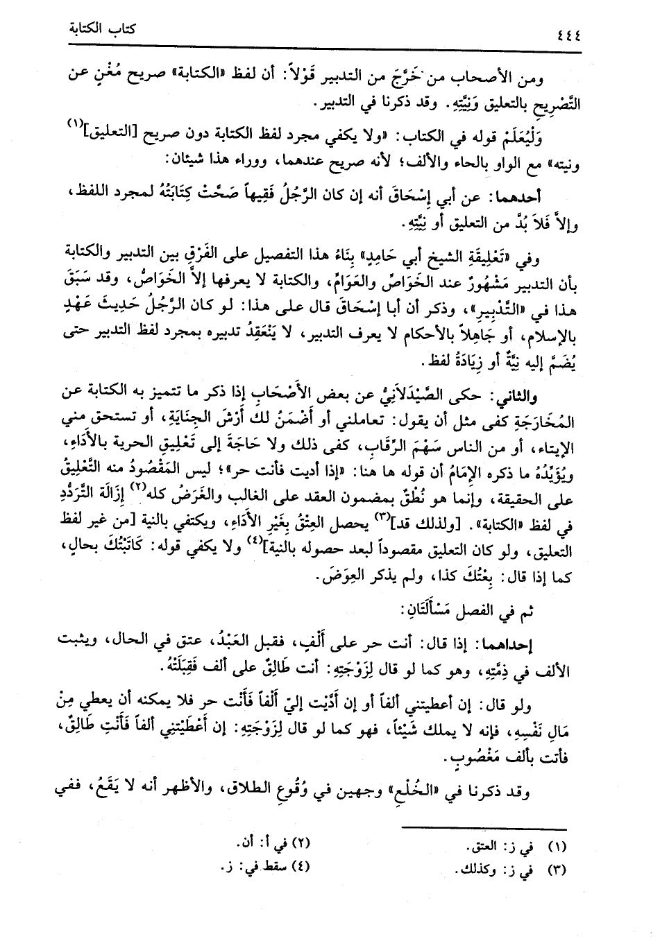 أحدهما: عن أبي إِسْحَاقَ أنه إن كان الرَّجُلُ فَقِيهاً صَحَّتْ كِتَابَتُهُ لمجرد اللفظ، وإلاَّ فَلاَ بُدَّ من التعليق أو نِيَّتِهِ.