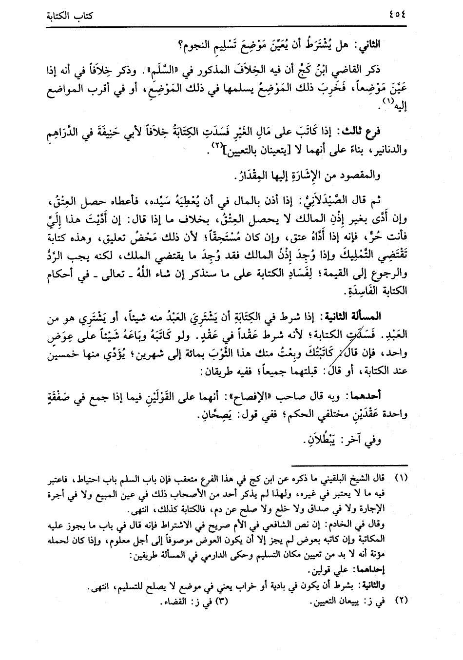 وقال في الخادم: إن نص الشافعي في الأم صريح في الاشتراط فإنه قال في باب ما يجوز عليه المكاتبة وإن كاتبه بعوض لم يجز إلا أن يكون العوض موصوفاً إلى أجل معلوم، وإذا كان لحمله مؤنة أنه لا بد من تعيين مكان التسليم وحكى الدارمي في المسألة طريقين: