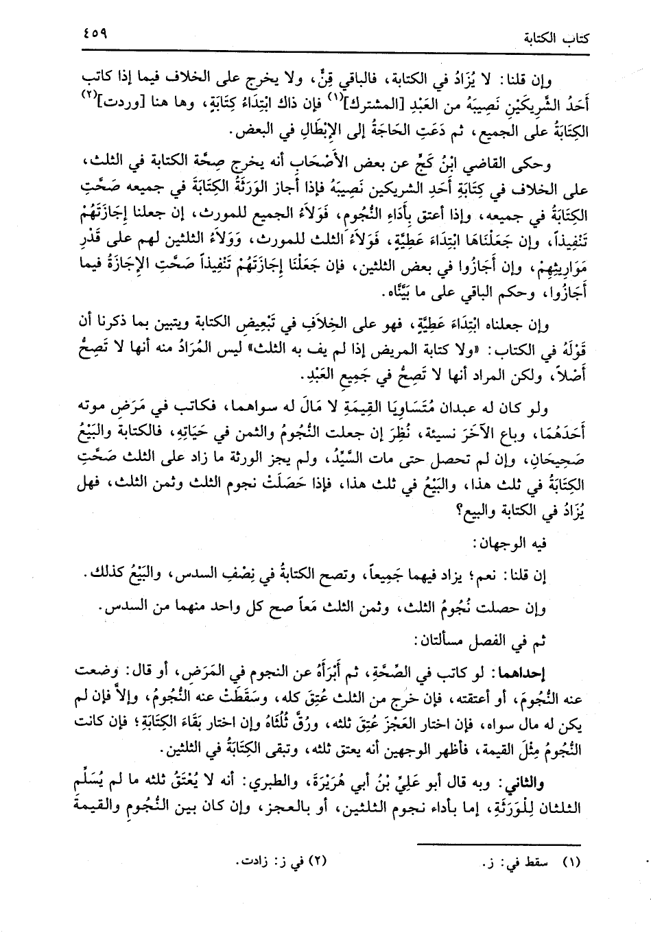 ولو كان له عبدان مُتَسَاوِيَا القِيمَةِ لا مَالَ له سواهما، فكاتب في مَرَضِ موته أَحَدَهُمَا، وباع الآخَرَ نسيئة، نُظِرَ إن جعلت النُّجُومُ والثمن في حَيَاتِهِ، فالكتابة والبَيْعُ صَحِيحَانِ، وإن لم تحصل حتى مات السَّيِّدُ، ولم يجز الورثة ما زاد على الثلث صَحَّتِ الكِتَابَةُ في ثلث هذا، والبَيْعُ في ثلث هذا، فإذا حَصَلَتْ نجوم الثلث وثمن الثلث، فهل يُزَادُ في الكتابة والبيع؟