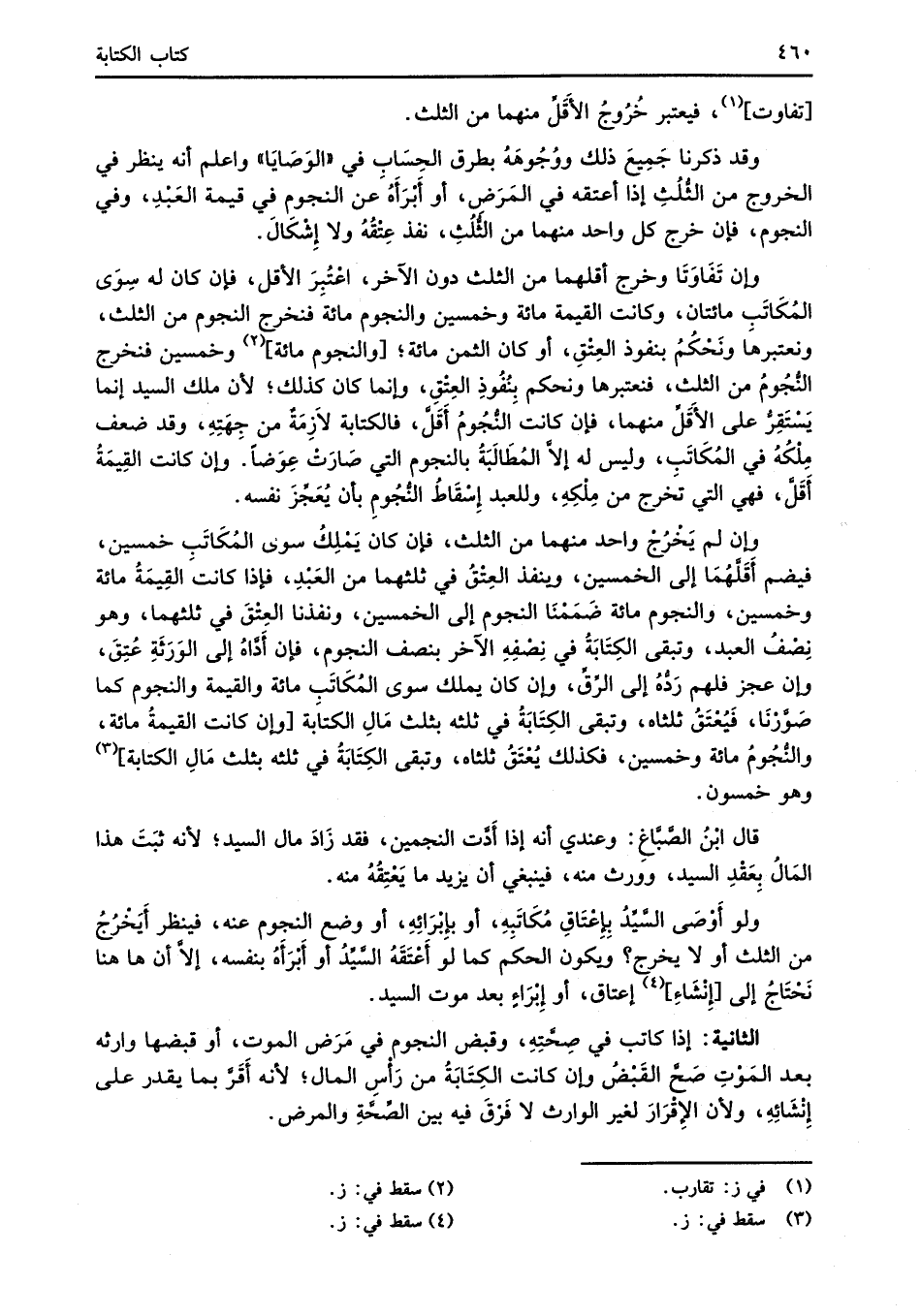 وإن تَفَاوَتَا وخرج أقلهما من الثلث دون الآخر، اعْتُبِرَ الأقل، فإن كان له سِوَى المُكَاتَب مائتان، وكانت القيمة مائة وخمسين والنجوم مائة فنخرج النجوم من الثلث، ونعتبرهَا ونَحْكُمُ بنفوذ العِتْقِ، أو كان الثمن مائة؛ [والنجوم مائة] (¬2) وخمسين فنخرج النُّجُومُ من الثلث، فنعتبرها ونحكم بِنُفُوذِ العِتْقِ، وإنما كان كذلك؛ لأن ملك السيد إنما يَسْتَقِرُّ على الأَقَلِّ منهما، فإن كانت النُّجُومُ أَقَلَّ، فالكتابة لاَزِمَةٌ من جِهَتِهِ، وقد ضعف مِلْكُهُ في المُكَاتَبِ، وليس له إلاَّ المُطَالَبَةُ بالنجوم التي صَارَتْ عِوَضاً. وإن كانت القِيمَةُ أَقَلَّ، فهي التي تخرج من مِلْكِهِ، وللعبد إِسْقَاطُ النُّجُومِ بأن يُعَجِّزَ نفسه.