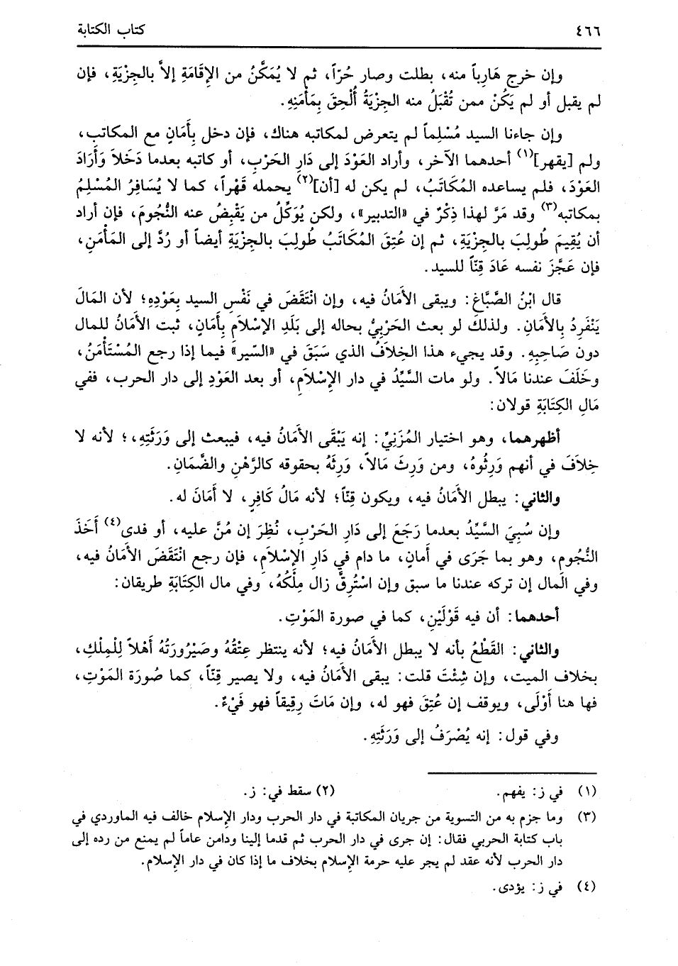 (¬3) وما جزم به من التسوية من جريان المكاتبة في دار الحرب ودار الإِسلام خالف فيه الماوردي في باب كتابة الحربي فقال: إن جرى في دار الحرب ثم قدما إلينا ودامن عاماً لم يمنع من رده إلى دار الحرب لأنه عقد لم يجر عليه حرمة الإِسلام بخلاف ما إذا كان في دار الإِسلام.