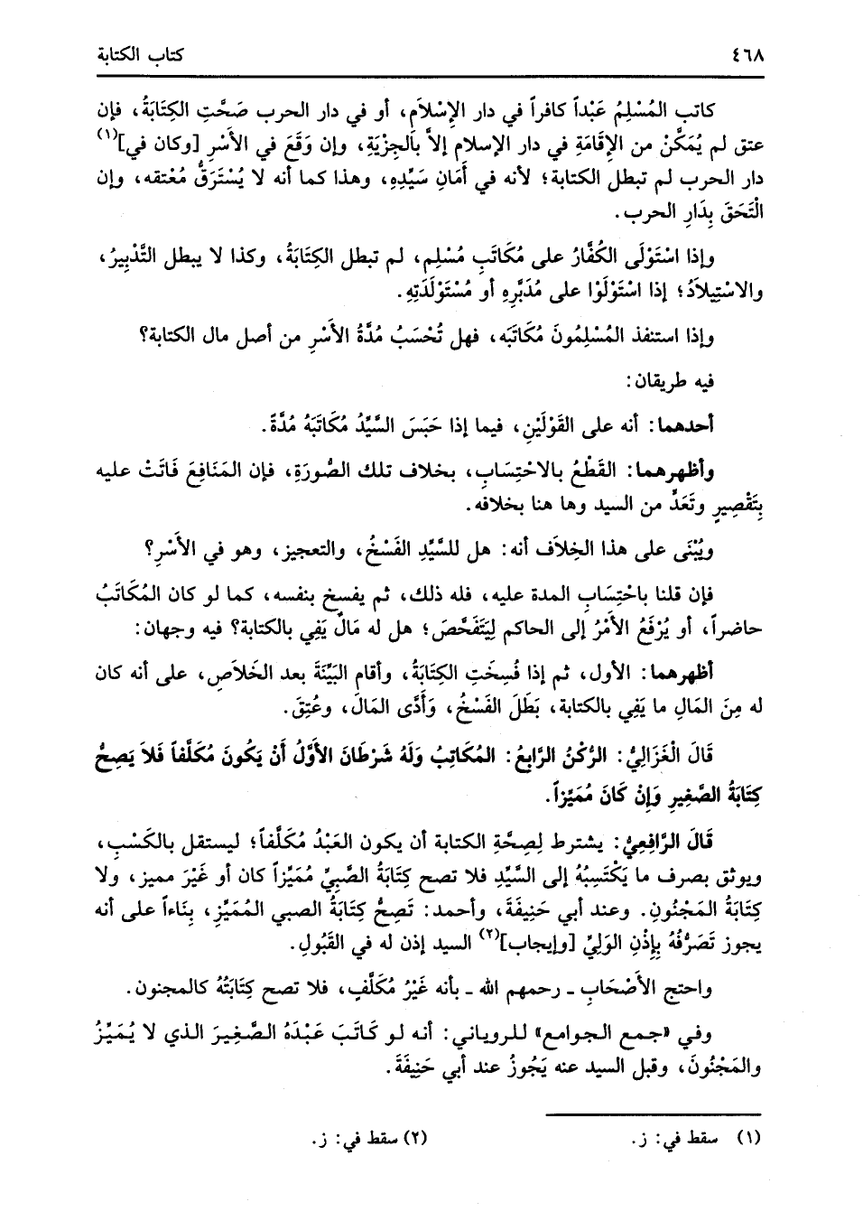 قَالَ الرَّافِعِيُّ: يشترط لِصِحَّةِ الكتابة أن يكون العَبْدُ مُكَلَّفاً؛ ليستقلى بالكَسْبِ، ويوثق بصرف ما يَكتَسِبُهُ إلى السَّيِّدِ فلا تصح كِتَابَةُ الصَّبِيِّ مُمَيِّزاً كان أو غَيْرَ مميز، ولا كِتَابَةُ المَجْنُونِ. وعند أبي حَنِيْفَةَ، وأحمد: تَصِحُّ كِتَابَةُ الصبي المُمَيِّزِ، بِنَاءاً على أنَّه يجوز تَصَرُّفُهُ بِإذنِ الوَليِّ [وإيجاب] (¬2) السيد إذن له في القَبُولِ.