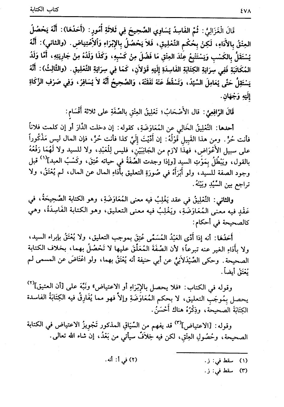والثاني: التَّعْلِيق في عقد يَغْلِبُ فيه معنى المُعَاوَضَةِ، وهو الكتابة الصَّحِيحَةُ، في عَقْدٍ فيه معنى المُعَاوَضَةِ، وَيَغْلِبُ فيه معنى التعليق، وهو الكتابة الفَاسِدَة، وهي كالصحيحة في أحكام: