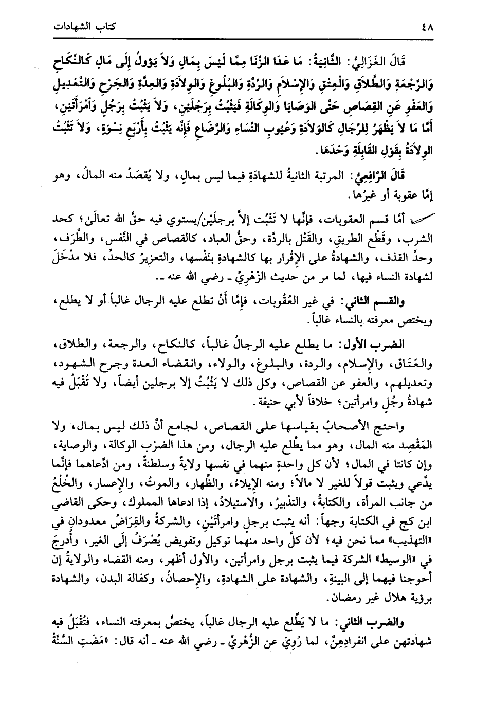 قَالَ الغَزَالِيُّ: الثَّانِيَةُ: مَا عَدَا الزِّنَا مِمَّا لَيْسَ بِمَالٍ وَلاَ يَؤولُ إِلَى مَالٍ كَالنِّكَاحِ وَالرَّجْعَة وَالطَّلاَقِ وَالْعِتْقِ وَالإسْلاَمِ وَالرِّدَّةِ وَالبُلُوغِ وَالوِلاَدَةِ وَالعِدَّةِ وَالجَرْحِ وَالتَّعْدِيلِ وَالعَفْوِ عَنِ القِصَاصِ حَتَّى الوَصَايَا وَالوِكَالَةِ فَيَثْبُتُ بِرَجُلَيْنِ، وَلاَ يَثْبُتُ بِرَجُلٍ وَامْرَأتيْنِ، أَمَّا مَا لاَ يَظْهَرُ لِلرِّجَالِ كَالوَلاَدَةِ وَعُيُوبِ النِّسَاءِ وَالرَّضَاعِ فَإِنَّه يَثْبُتُ بِأَرْبَعِ نِسْوَةٍ، وَلاَ تَثْبُتُ الوِلاَدَةُ بِقَوْلِ القَابِلَةِ وَحْدَهَا.