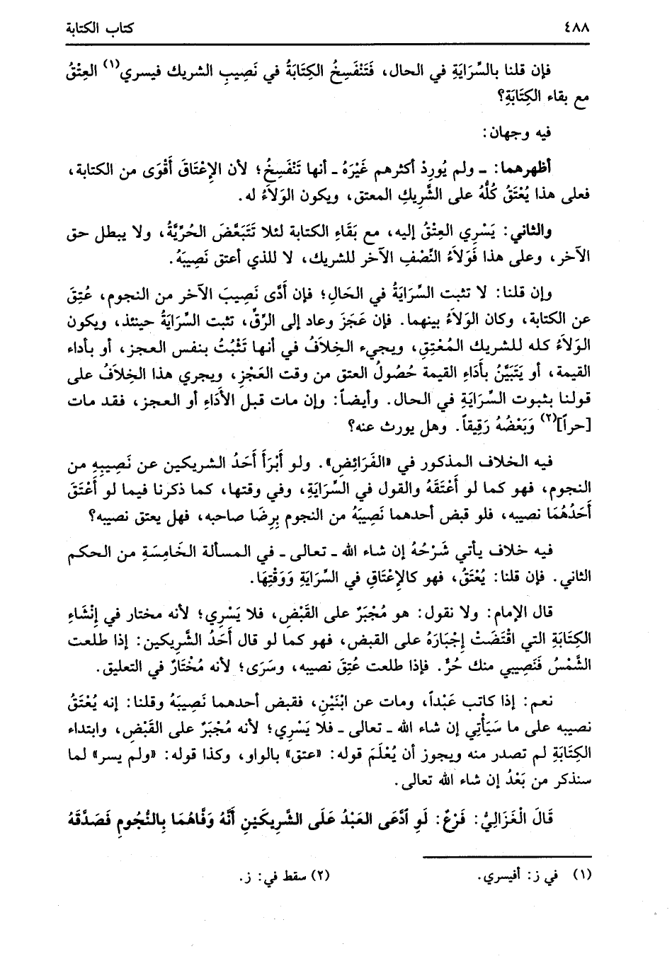 والثاني: يَسْرِي العِتْقُ إليه، مع بَقَاءِ الكتابة لئلا تَتَبَعَّضَ الحُرِّيَّةُ، ولا يبطل حق الآخر، وعلى هذا فَوَلاءُ النِّصْفِ الآخر للشريك، لا للذي أعتق نَصِيبَهُ.