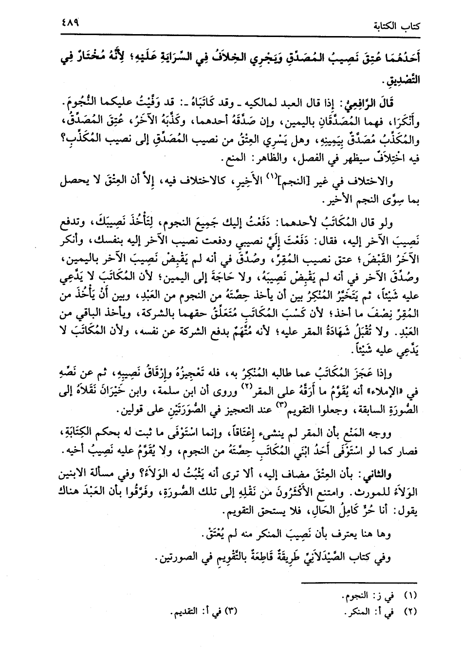 قَالَ الرَّافِعِيُّ: إذا قال العبد لمالكيه -وقد كَاتَبَاهُ-: قد وَفَّيْتُ عليكما النُّجُومَ. وأَنْكَرَا، فهما المُصَدَّقَانِ باليمين، وإن صَدَّقَهُ أحدهما، وكَذَّبَهُ الآخَرُ، عُتِقَ المُصَدِّقُ، والمُكَذِّبُ مُصَدَّقٌ بِيَمِينِهِ، وهل يَسْرِي العِتْقُ من نصيب المُصَدِّقِ إلى نصيب المُكَذِّب؟ فيه اخْتِلاَفٌ سيظهر في الفصل، والظاهر: المنع.