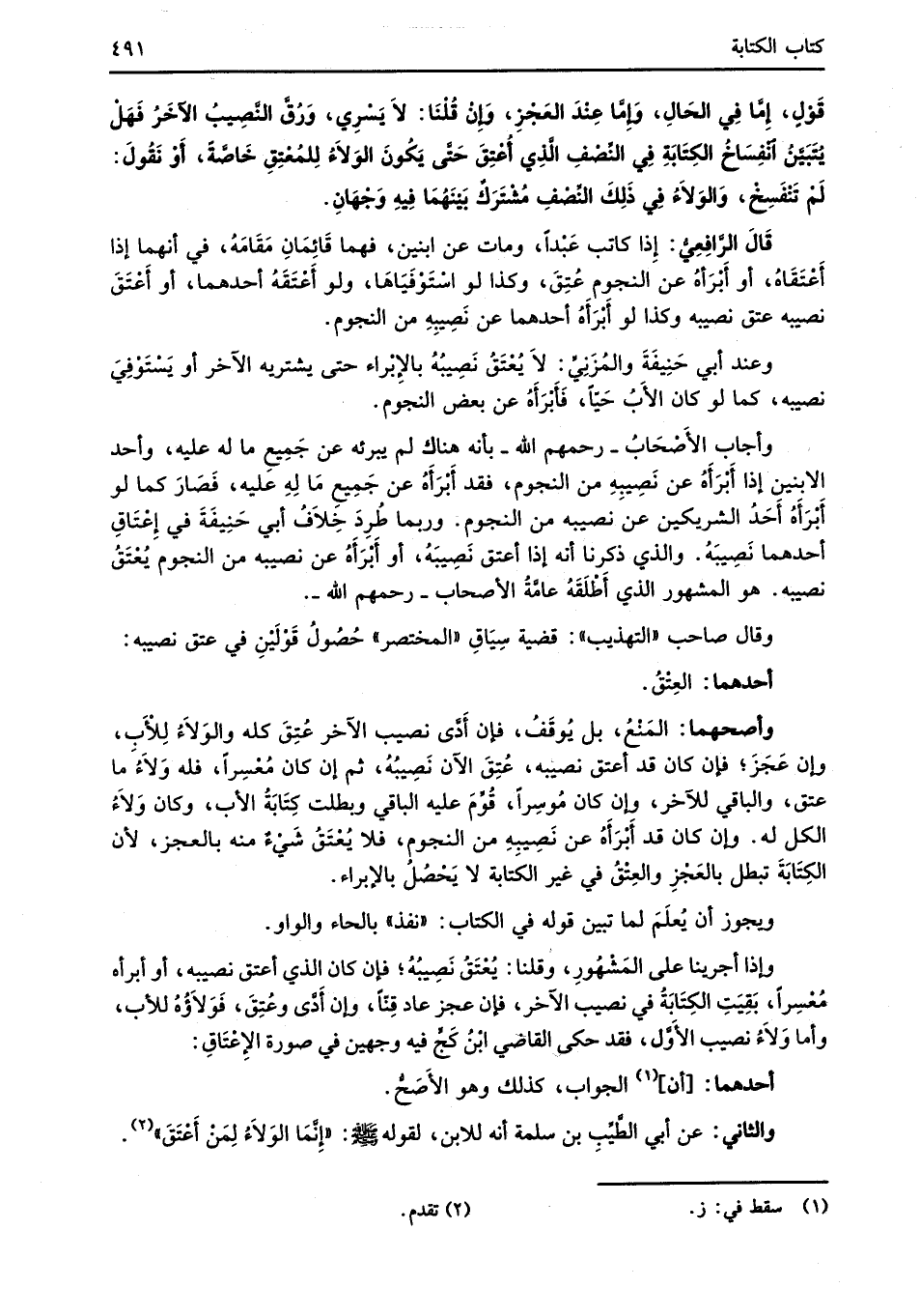 قَوْلٍ، إمَّا فِي الحَالِ، وَإمَّا عِنْدَ العَجْزِ، وَإِنْ قُلنَا: لاَ يَسْرِي، وَرُقَّ النَّصِيبُ الآخَرُ فَهَلْ يُتَبَيَّنُ انْفِسَاخُ الكِتَابَةِ فِي النِّصْفِ الَّذِي أُعْتِقَ حَتَّى يَكُونَ الوَلاَءُ لِلمُعْتِقِ خَاصَّةً، أَوْ نَقُولَ: لَمْ تَنْفَسِخْ، وَالوَلاَءُ فِي ذَلِكَ النِّصْفِ مُشْتَرَكٌ بَيْنَهُمَا فِيهِ وَجْهَانِ.