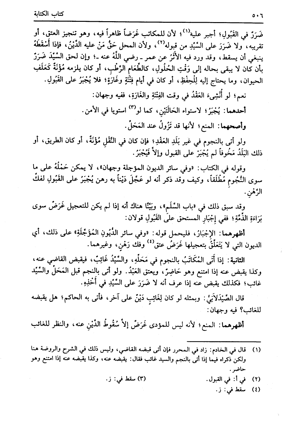 ضَرَرٌ في القَبُولِ؛ أجبر عليه (¬1)؛ لأن للمكاتب غَرَضاً ظاهراً فيه، وهو تنجيز العتق، أو تقريبه، ولا ضَرَرَ على السَّيِّدِ من قبوله (¬2)، ولأن المحل حَقُّ مَنْ عليه الدَّيْنُ، فإذا أَسْقَطَهُ ينبغي أن يسقط، وقد ورد فيه الأَثَرُ عن عمر -رضي اللهُ عنه-؛ كان لحق السَّيِّدَ ضَرَرٌ بأن كان لا يبقى بحاله إلى وَقْتِ الحُلُولِ، كالطَّعَامِ الرَّطْبِ، أو كان يلزمه مُؤنَةٌ كَعَلَفِ الحيوان، وما يحتاج إليه لِلْحِفْظِ، أو كان في أيام فِتْنَةٍ وغَارَةٍ؛ فلا يُحْبَرُ على القَبُولِ.