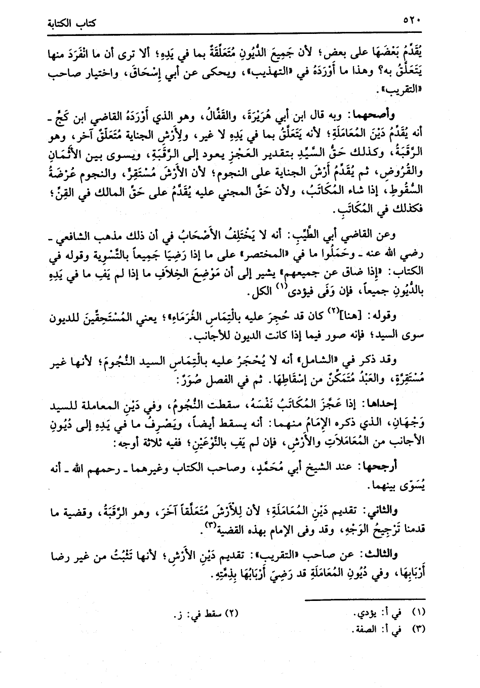 والثالث: عن صاحب "التقريب": تقديم دَيْنِ الأَرْشِ؛ لأنها تَثبُتُ من غير رضا أَرْبَابِهَا، وفي دُيُونِ المُعَامَلَةِ قد رَضِيَ أَرْبَابُهَا بِذِمَّتِهِ.