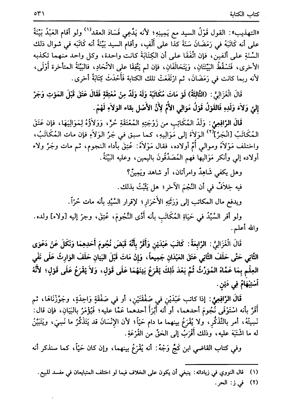 قَالَ الرَّافِعِيُّ: إذا كاتب عَبْدَيْنِ في صَفْقَتَيْنِ، أو في صَفْقَةٍ وَاحِدَةٍ، وجَوَّزْنَاهَا، ثم أَقَرَّ بأنه اسْتَوْفَى نُجُومَ أحدهما، أوَ أنه أبْرَأَ أحدهما عَمَّا عليه؛ فَيُؤْمَرُ بالبَيَانِ، فإن قال: نَسِيتُهُ، أمر بالتَّذَكُّرِ، ولا يُقْرَعُ بينهما ما دام حَيّاً؛ لأن الإِنْسَانَ قد يَتَذَكَّرُ ما نَسِيَ، وَيَتَبَيَّنُ له ما اشْتَبَهَ عليه، وذلك أَقْرَبُ إلى الحَقِّ من القُرْعَةِ.