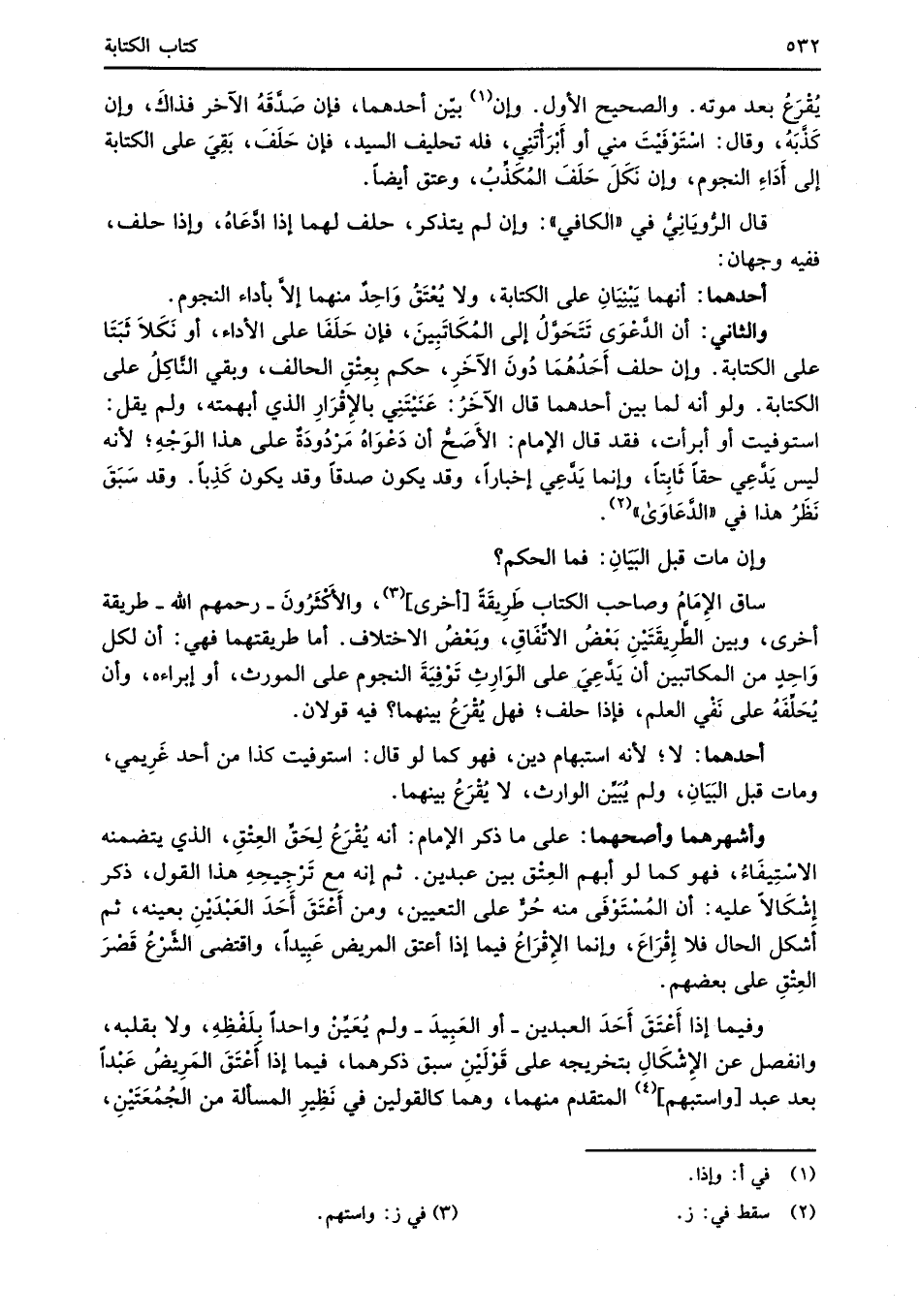 ساق الإِمَامُ وصاحب الكتاب طَرِيقَةً [أخرى] (¬2)، والأكْثَرُونَ -رحمهم الله- طريقة أخرى، وبين الطَّرِيقَتَيْنِ بَعْضُ الاتِّفَاقِ، وبَعْضُ الاختلاف. أما طريقتهما فهي: أن لكل وَاحِدٍ من المكاتبين أن يَدَّعِيَ على الوَارِثِ توْفِيَةَ النجوم على المورث، أو إبراءه، وأن يُحَلِّفَهُ على نَفْي العلم، فإذا حلف؛ فهل يُقْرَعُ بينهما؟ فيه قولان.