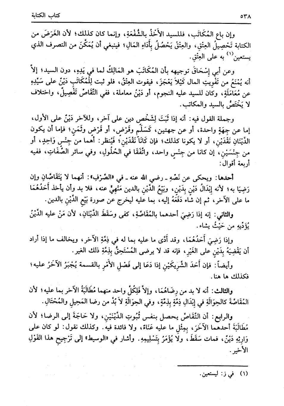 وعن أبي إِسْحَاقَ توجيهه بأن المُكَاتَبَ هو المَالِكُ لما في يَدِهِ، دون السيد؛ إلاَّ أنه يُمْنَعُ من تفْوِيتِ المال كَيْلاَ يَعْجَزَ، فيفوت العِتْقُ، فلو ثبت لِلْمُكَاتَبِ دَيْنٌ على سَيِّدِهِ عن مُعَامَلةٍ، وكان للسيد عليه النجوم، أو دَيْنُ معاملة، ففي التَّقَاصِّ تَفْصِيلٌ، واختلاف لا يَخْتَصُّ بالسيد والمكاتب.