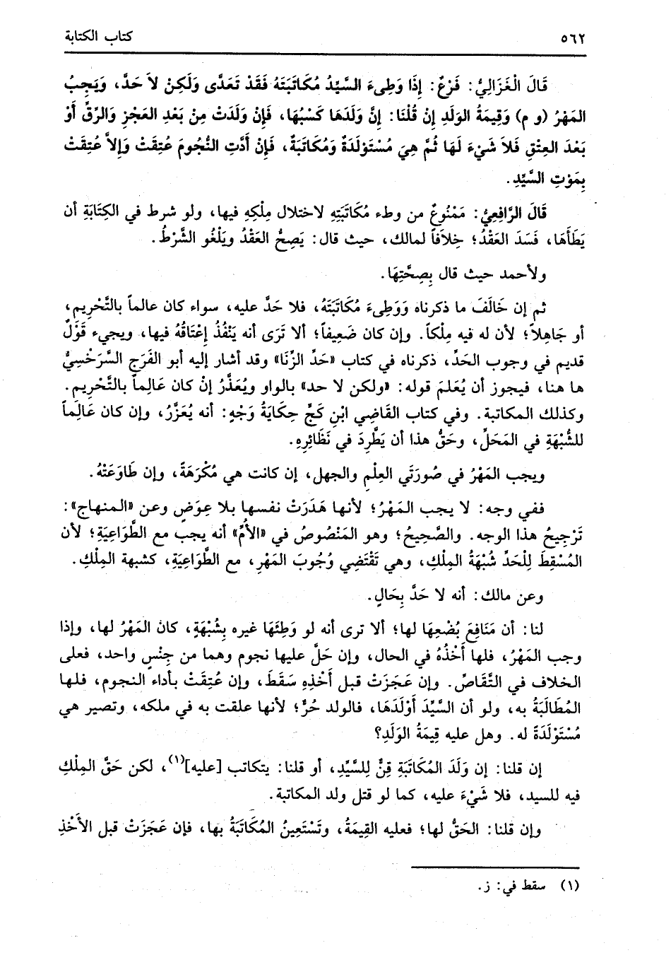 قَالَ الْغَزَالِيُّ: فَرْعٌ: إذَا وَطِئَ السَّيِّدُ مُكَاتَبَتَهُ فَقَدْ تَعَدَّى وَلَكِنْ لاَ حَدَّ، وَيَجِبُ المَهْرُ (وم) وَقِيمَةُ الوَلَدِ إِنْ قُلْنَا: إِنَّ وَلَدَهَا كَسْبُهَا، فَإِنْ وَلَدَتْ مِنْ بعْدِ العَجْزِ وَالرِّقِّ أَوْ بَعْدَ العتْقِ فَلاَ شَيْءَ لَهَا ثُمَّ هِيَ مُسْتوْلَدَةٌ وَمُكَاتَبَةٌ، فَإِنْ أَدَّتِ النُّجُومَ عُتِقتْ وَإلاَّ عُتِقَتْ بِمَوْتِ السَّيِّدِ.