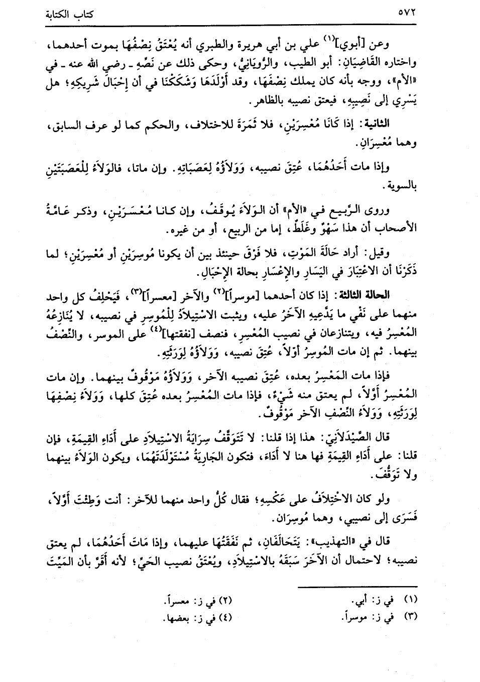وقيل: أراد حَالَةَ الموْتِ، فلا فرْقَ حينئذ بين أن يكونا مُوسِرَيْنِ أو مُعْسِرَيْنِ؛ لما ذَكَرْنَا أن الاعْتِبَارَ في اليَسَارِ والإِعْسَارِ بحالة الإِحْبَالِ.