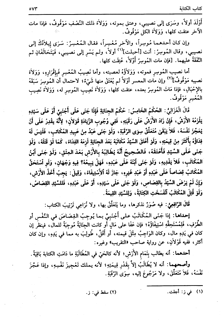قَالَ الْغَزَالِيُّ: الحُكْمُ الخَامِسُ: حُكْمُ الجِنَايَةِ فَإذَا جَنَى عَلَى أَجْنَبِيَّ أَوْ عَلَى سَيِّدِهِ يَلْزَمُهُ الأَرْشُ، فَإِنْ زَادَ الأَرْشُ عَلَى رَقَبَتِهِ، فَفِي وُجُوبِ الزِّيَادَةِ قَوْلاَنِ؛ لِأنَّهُ يقْدِرُ عَلَى أَنْ يُعَجِّزَ نَفْسَهُ، فلاَ يَبْقَى مُتَعَلَّقٌ سِوَى الرَّقَبَةِ، وَلَوْ جَنَى عَبْدٌ مِنْ عَبِيدِ المُكَاتبِ، فَلَيْسَ لَهُ فِدَاؤُهُ بأَكْثَرَ مِنْ قِيمَتِهِ، وَلَوْ أَعْتَقَ السَّيِّدُ مُكَاتَبَهُ بَعْدَ الجِنَايَةِ لَزِمَهُ الفِدَاءُ، كَمَا لَوْ قَتَلَهُ، وَلَوْ جَنَى عَلَى السَّيِّدِ فَأعْتَقَهُ، فَالصَّحِيحُ أنَّهُ يُطَالِبُهُ بِالأَرْشِ بَعْدَ العِتْقِ، وَلَوْ جَنَى ابْنُ المُكَاتَبِ، فَلاَ يَفْدِيهِ، وَلَوْ جَنَى ابْنُهُ عَلَى عَبْدِهِ، فَهَلْ يَبِيعُهُ؟ فِيهِ وَجْهَانِ، وَلَوِ اسْتَحَقَّ المُكَاتبُ قِصَاصاً عَلَى عَبْدِهِ أَوْ عَبْدِ غَيْرِهِ، جَازَ لَهُ الاسْتِيفَاءُ، وقِيلَ: يَجِبُ أَخْذُ الأَرْشِ، وَإِنْ لَمْ يَرْضَ السَّيِّدُ بِالقِصَاصِ، وَلَوْ جَنَى عَلَى سَيِّدِهِ، أَوْ عَلَى عَبْدِهِ، فَللسَّيِّدِ القِصَاصُ، وَلَوْ قُتِلَ المُكَاتَبُ انْفَسَخَتِ الكِتَابَةُ، وَللسَّيِّدِ القِيمَةُ.