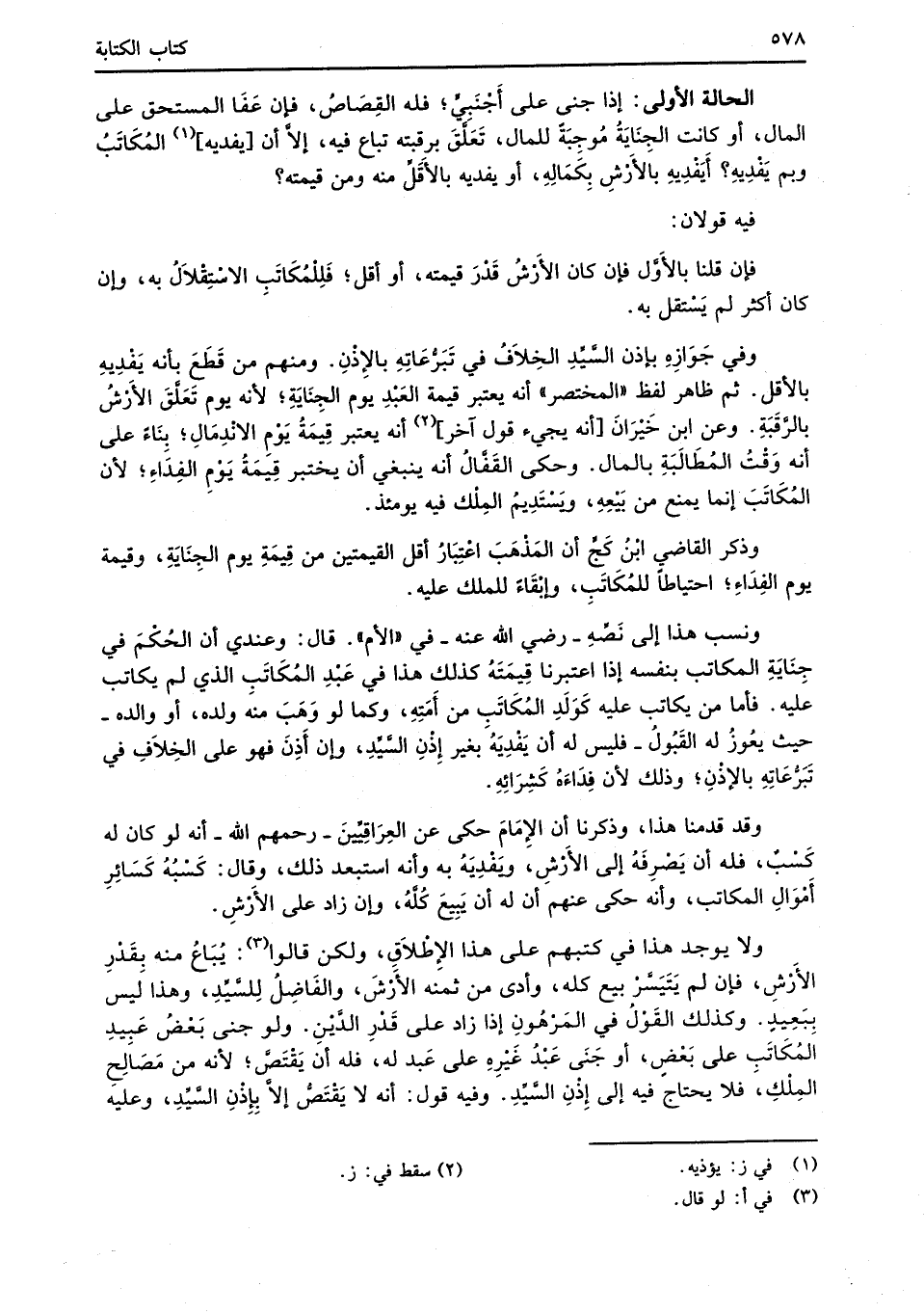 وقد قدمنا هذا، وذكرنا أن الإِمَامَ حكى عن العِرَاقِيِّينَ -رحمهم الله- أنه لو كان له كَسْبٌ، فله أن يَصْرِفَهُ إلى الأَرْشِ، ويَفْدِيَهُ به وأنه استبعد ذلك، وقال: كَسْبُهُ كَسَائِرِ أَمْوَالِ المكاتب، وأنه حكى عنهم أن له أن يَبِيعَ كُلَّهُ، وإن زاد على الأَرْشِ.