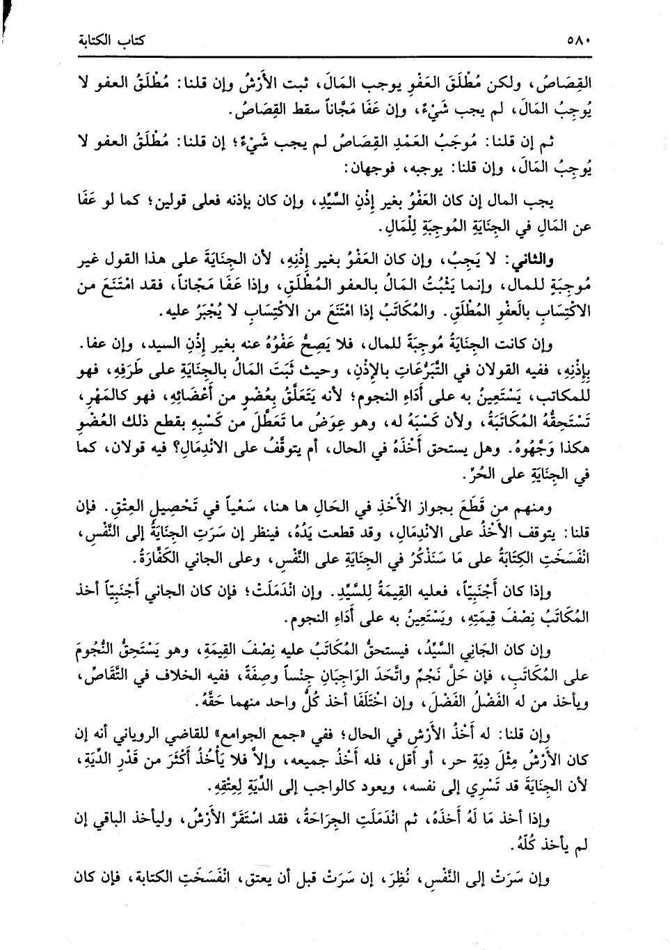والثاني: لا يَجِبُ، وإن كان العَفْوُ بغير إِذْنِهِ؛ لأن الجِنَايَةَ على هذا القول غير مُوجِبَةٍ للمال، وإنما يَثْبُتُ المَالُ بالعفو المُطْلَقِ، وإذا عَفَا مَجّاناً، فقد امْتَنَعَ من الاكْتِسَابِ بالَعفْوِ المُطْلَقِ. والمُكَاتَبُ إذا امْتَنَعَ من الاكْتِسَابِ لا يُجْبَرُ عليه.