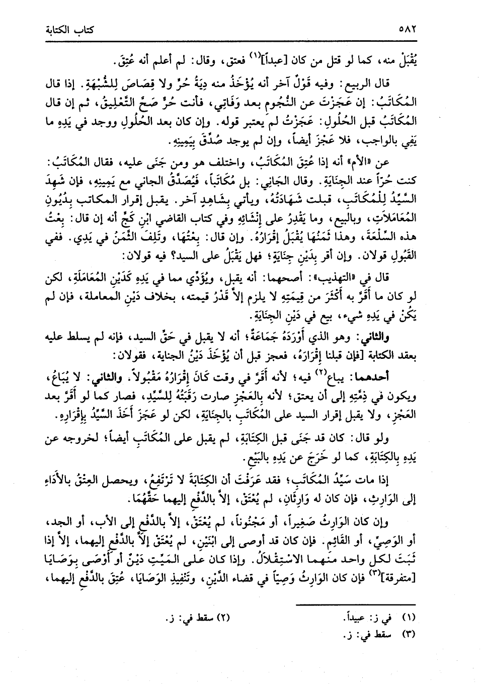 قال الربيع: وفيه قَوْلٌ آخر أنه يُؤْخَذُ منه دِيَةُ حُرٍّ ولا قِصَاصَ لِلشُّبْهَةِ. إذا قال المُكَاتَبُ: إن عَجَزْتَ عن النُّجُوم بعد وَفَاتِي، فأنت حُرٌّ صَحَّ التَّعْلِيقُ، ثم إن قال المُكَاتَبُ قبل الحُلُولِ: عَجَزْتُ لم يعتبر قوله. وإن كان بعد الحُلُولِ ووجد في يَدِهِ ما يَفِي بالواجب، فلا عَجْزَ أيضاً، وإن لم يوجد صُدِّقَ بِيَمِينِهِ.