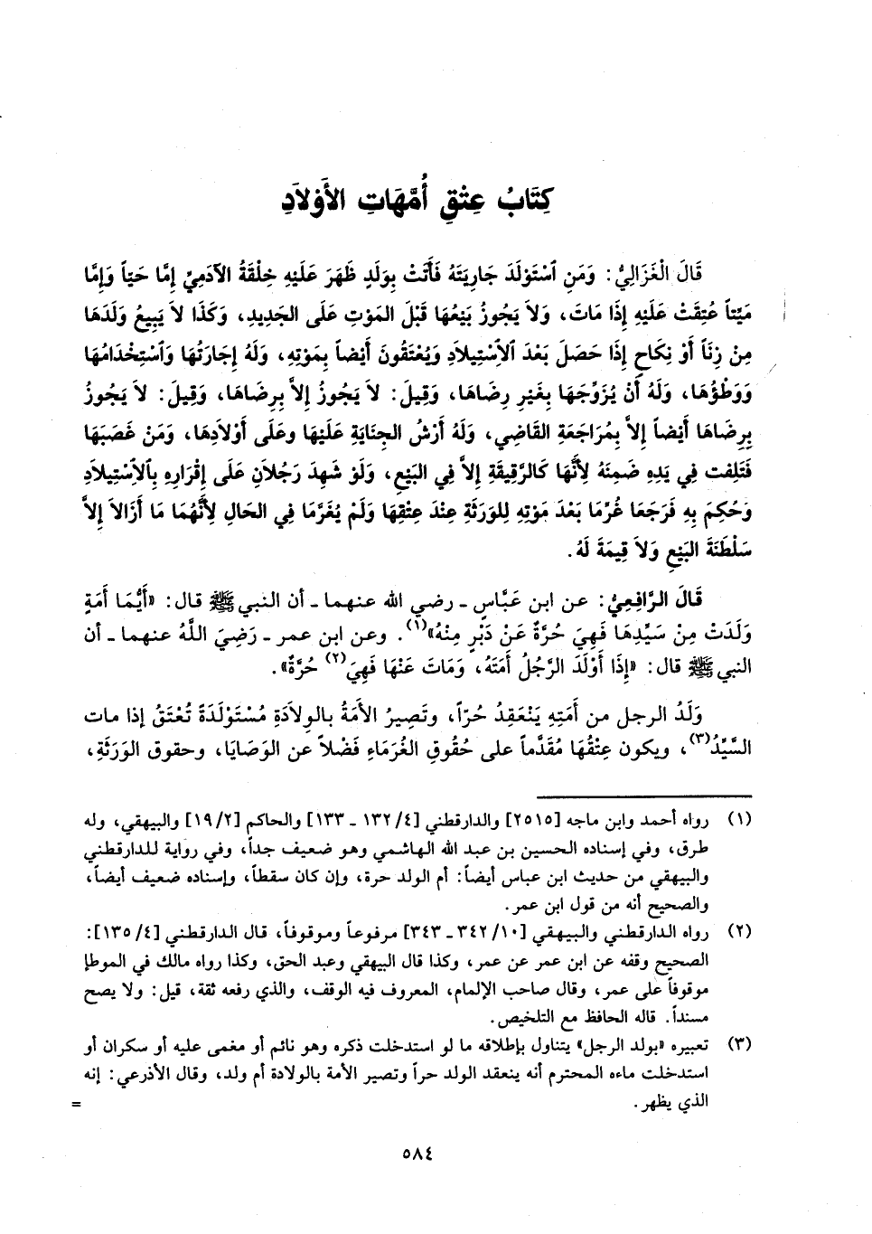 (¬1) رواه أحمد وابن ماجه [2515] والدارقطني [4/ 132 - 133] والحاكم [2/ 19] والبيهقي، وله طرق، وفي إسناده الحسين بن عبد الله الهاشمي وهو ضعيف جداً، وفي رواية للدارقطني والبيهقي من حديث ابن عباس أيضاً: أم الولد حرة، وإن كان سقطاً، وإسناده ضعيف أيضاً، والصحيح أنه من قول ابن عمر.