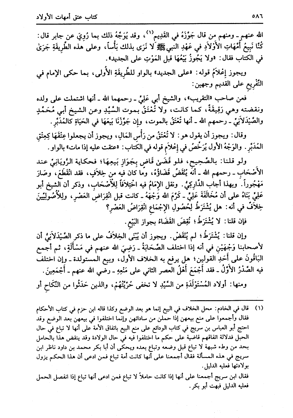 (¬1) قال في الخادم: محل الخلاف في البيع إنما هو بعد الوضع وكذا قاله ابن حزم في كتاب الأحكام فقال وأجمعوا على منع بيعهن إذا حملن من ساداتهن وإنما اختلفوا في بيعهن بعد الوضع وقد احتج أبو العباس بن سريج في كتاب الودائع على منع البيع باتفاق الأمة على أنها لا تباع في حال الحبل فدلالة اتفاقهم قاضية على حكم ما اختلفوا فيه في حال الولادة وقد ينقض هذا بالحامل بحد من وطء شبهة لا تباع قبل وضعه وتباع بعده ويحكى أن أبا بكر محمد بن داود ناظر ابن سريج في هذه المسألة فقال أجمعنا على أنها كانت أمة تباع فمن ادعى أن هذا الحكم يزول بولادتها فعليه الدليل.