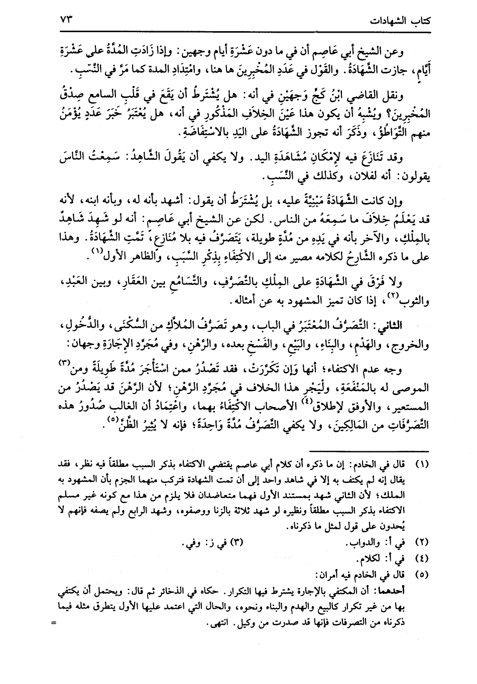 (¬1) قال في الخادم: إن ما ذكره أن كلام أبي عاصم يقتضي الاكتفاء بذكر السبب مطلقاً فيه نظر، فقد يقال إنه لم يكتف به إلا في شاهد واحد إلى أن تمت الشهادة فتركب منهما الجزم بأن المشهود به الملك؛ لأن الثاني شهد بمستند الأول فهما متعاضدان فلا يلزم من هذا مع كونه غير مسلم الاكتفاء بذكر السبب مطلقاً ونظيره لو شهد ثلاثة بالزنا ووصفوه، وشهد الرابع ولم يصفه فإنهم لا يُحدون على قول لمثل ما ذكرناه.