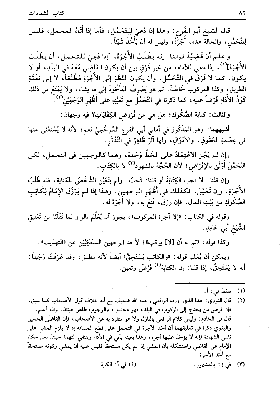 واعلم أن قَضيَّةَ قولنا: إنه يَطْلُبُ الأُجْرَةَ، [إذا دُعِيَ للتحمل، أن يَطْلُبَ الأُجْرَةَ] (¬1)، إذا دعي للأداء، من غير فَرْقٍ بين أن يكون القَاضِي مَعَهُ فِي البَلَدِ، أو لا يكون. كما لا فَرْقَ في التَّحَمُّلِ، وأن يكون النَّظَرُ إلى الأُجْرَةِ مُطْلَقاً، لا إلى نَفَقَةِ الطريق، وكذا المركوب خَاصَّةً. ثم هو يَصْرِفُ المَأْخُوذَ إلى ما يشاء، ولا يَمْنَعُ من ذلك كَوْنُ الأَدَاءِ فَرْضاً عليه، كما ذكرنا في التَّحَمُّلِ مع تَعيُّنِهِ على أَظْهَرِ الوَجْهَيْنِ (¬2).