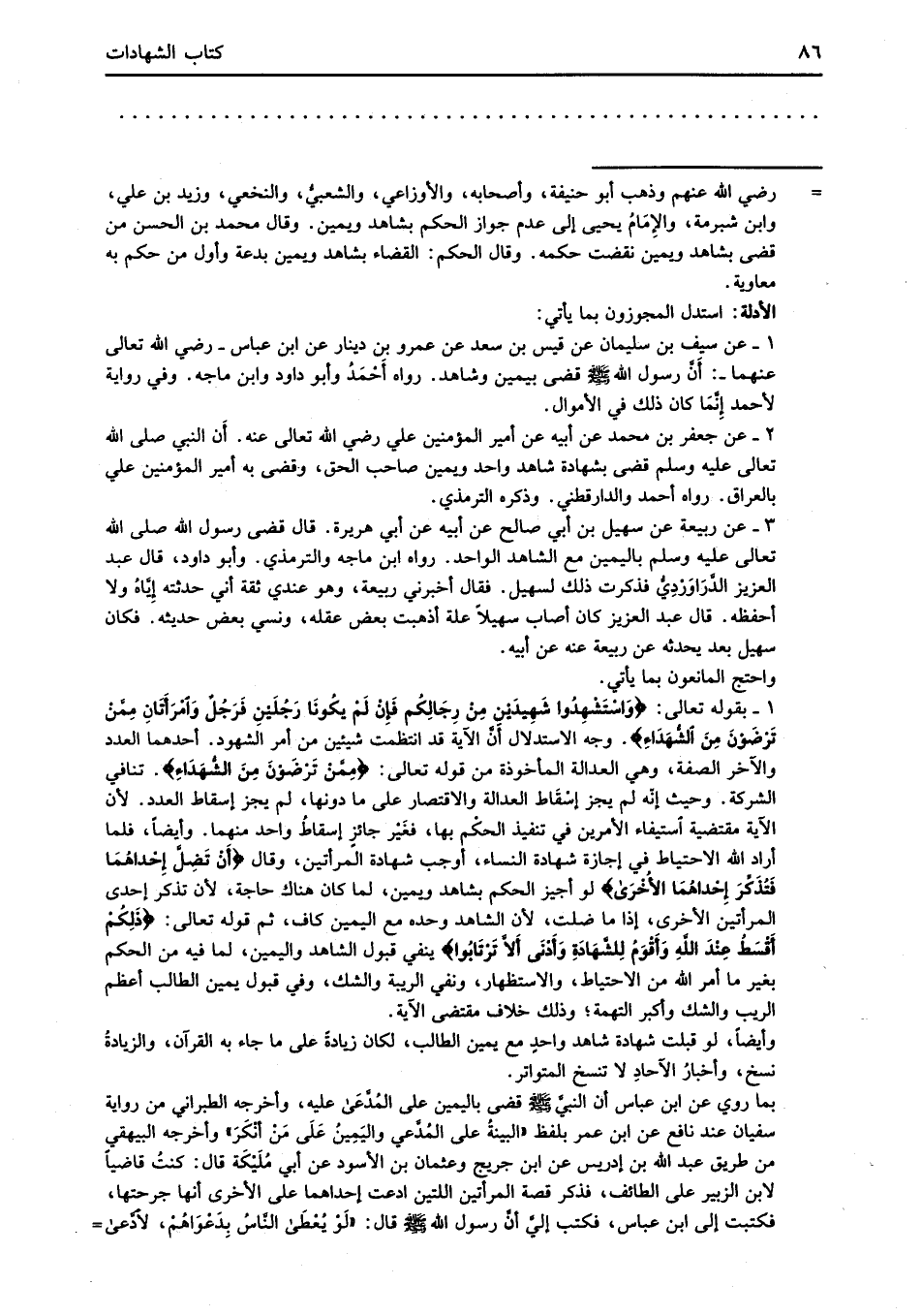 1 - بقوله تعالى: {وَاسْتَشْهِدُوا شَهِيدَيْنِ مِنْ رِجَالِكُمْ فَإِنْ لَمْ يَكُونَا رَجُلَيْنِ فَرَجُلٌ وَامْرَأَتَانِ مِمَّنْ تَرْضَوْنَ مِنَ الشُّهَدَاءِ}.وجه الاستدلال أَنَّ الآية قد انتظمت شيئين من أمر الشهود. أحدهما العدد والآخر الصفة، وهي العدالة المأخوذة من قوله تعالى: {مِمَّنْ تَرْضَوْنَ مِنَ الشُّهَدَاءِ}.تنافي الشركة. وحيث إنّه لم يجز إسْقَاط العدالة والاقتصار على ما دونها لم يجز إسقاط العدد. لأن الآية مقتضية استيفاء الأمرين في تنفيذ الحكْم بها، فغَيْر جائزٍ إسقاطُ واحد منهما. وأيضاً، فلما أراد الله الاحتياط في إجازة شهادة النساء، أوجب شهادة المرأتين، وقال {أَنْ تَضِلَّ إِحْدَاهُمَا فَتُذَكِّرَ إِحْدَاهُمَا الْأُخْرَى} لو أجيز الحكم بشاهد ويمين، لما كان هناك حاجة؛ لأن تذكر إحدى المرأتين الأخرى، إذا ما ضلت؛ لأن الشاهد وحده مع اليمين كاف، ثم قوله تعالى: {ذَلِكُمْ أَقْسَطُ عِنْدَ اللَّهِ وَأَقْوَمُ لِلشَّهَادَةِ وَأَدْنَى أَلَّا تَرْتَابُوا} ينفي قبول الشاهد واليمين، لما فيه من الحكم بغير ما أمر الله من الاحتياط، والاستظهار، ونفي الريبة والشك، وفي قبول يمين الطالب أعظم الريب والشك وأكبر التهمة؛ وذلك خلاف مقتضى الآية.