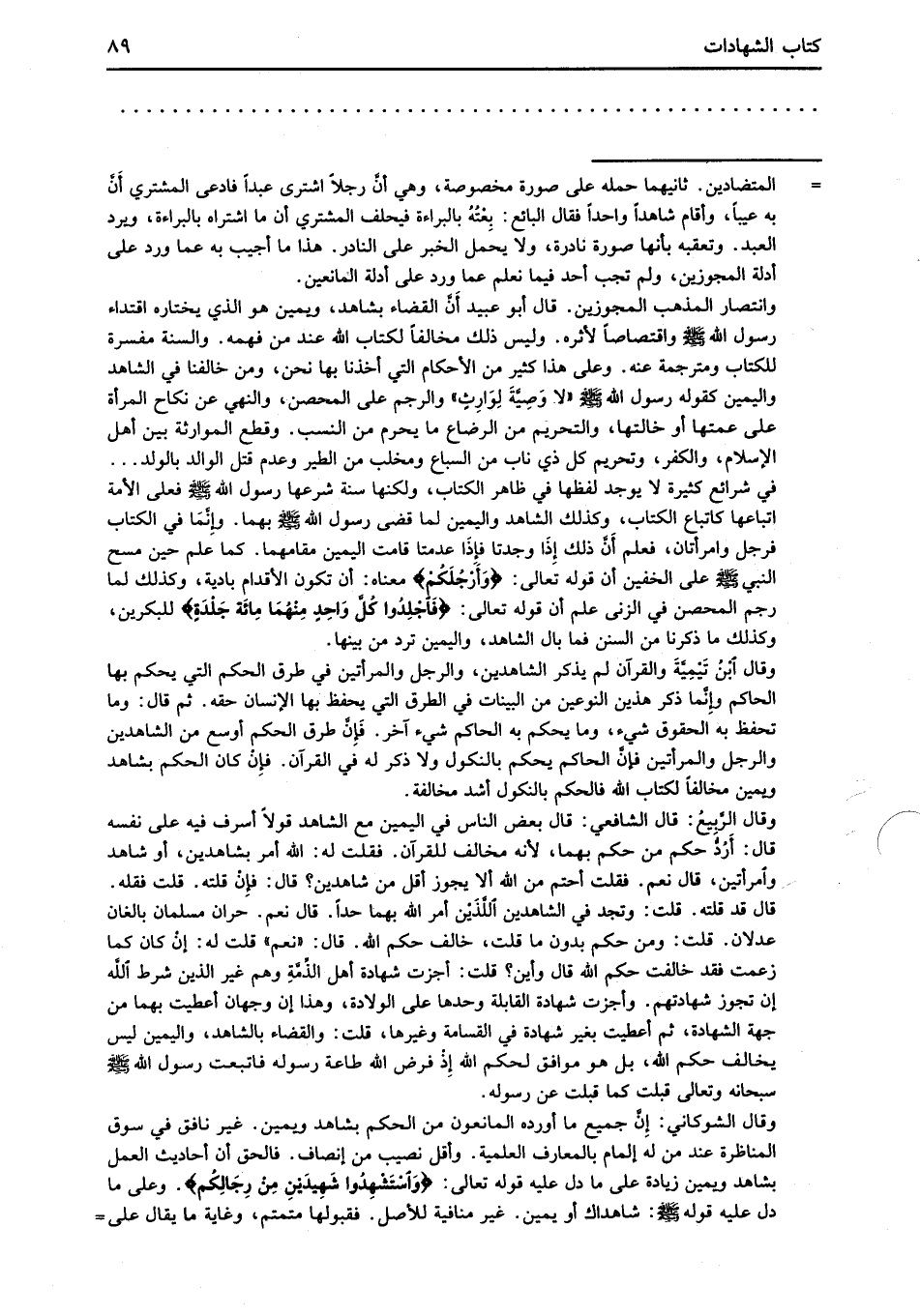 وقال الشوكاني: إنَّ جميع ما أورده المانعون من الحكم بشاهد ويمين. غير نافق في سوق المناظرة عند من له إلمام بالمعارف العلمية. وأقل نصيب من إنصاف. فالحق أن أحاديث العمل بشاهد ويمين زيادة على ما دل عليه قوله تعالى: {وَاسْتَشْهِدُوا شَهِيدَيْنِ مِنْ رِجَالِكُمْ}. وعلى ما دل عليه قوله -صلى الله عليه وسلم-: شاهداك أو يمين. غير منافية للأصل. فقبولها متمتم، وغاية ما يقال على =
