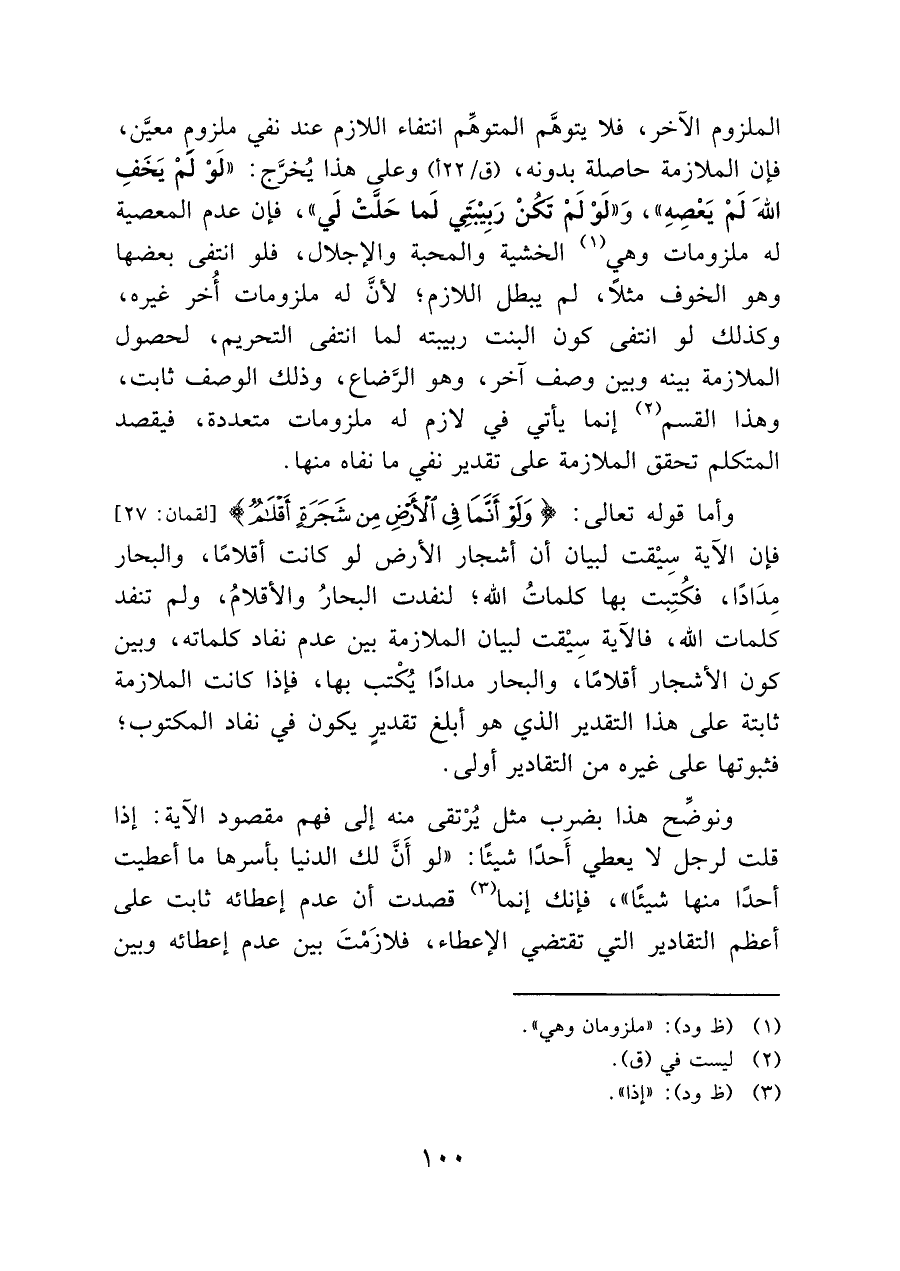 وأما قوله تعالى: {وَلَوْ أَنَّمَا فِي الْأَرْضِ مِنْ شَجَرَةٍ أَقْلَامٌ} [لقمان: ٢٧] فإن الآية سِيْقت لبيان أن أشجار الأرض لو كانت أقلامًا، والبحار: مِدَادًا، فكتِبت بها كلماتُ الله؛ لنفدت البحارُ والأقلام، ولم تنفد كلمات الله، فالآية سِيْقت لبيان الملازمة بين عدم نفاد كلماته، وبين كون الأشجار أقلامًا، والبحار مدادًا يكتب بها، فإذا كانت الملازمة ثابتة على هذا التقدير الذي هو أبلغ تقديرٍ يكون في نفاد المكتوب؛ فثبوتها على غيره من التقادير أولى.