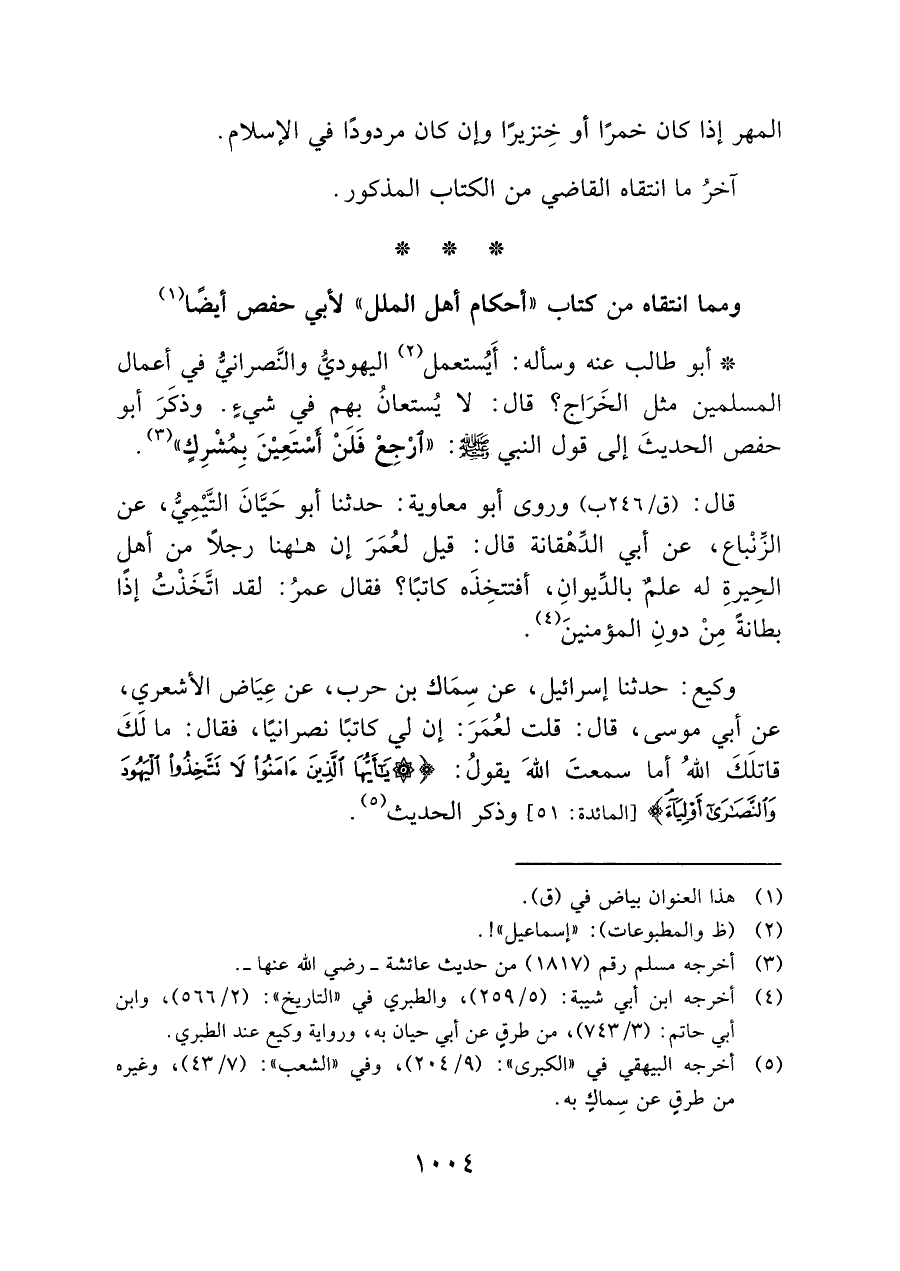 * أبو طالب عنه وسأله: أَيُستعمل (¬٢) اليهوديُّ والنَّصرانيُّ في أعمال المسلمين مثل الخَرَاج؟ قال: لا يُستعانُ بهم في شيءٍ. وذكَرَ أبو حفص الحديث إلى قول النبي - صلى الله عليه وسلم -: "ارْجِعْ فَلَنْ أَسْتَعِيْنَ بِمُشْرِكٍ" (¬٣).