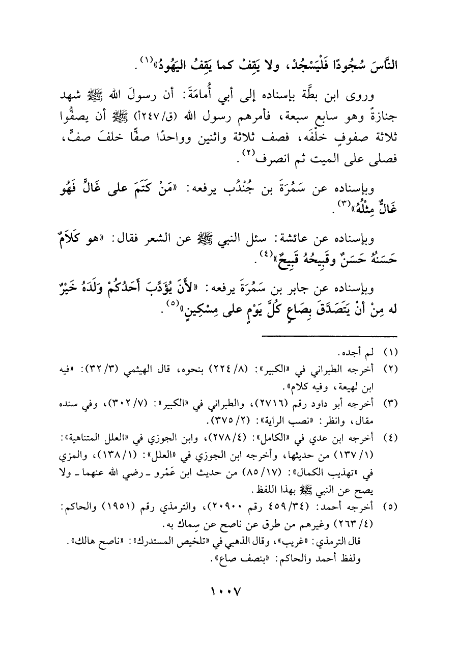 وبإسناده عن جابر بن سَمُرَةَ يرفعه: "لأَن يُؤَدِّبَ أَحَدُكُمْ وَلَدَهُ خَيْرٌ له مِنْ أنْ يَتَصَدَّقَ بِصَاعٍ كُلِّ يَوْمٍ على مِسْكِينٍ" (¬٥).
