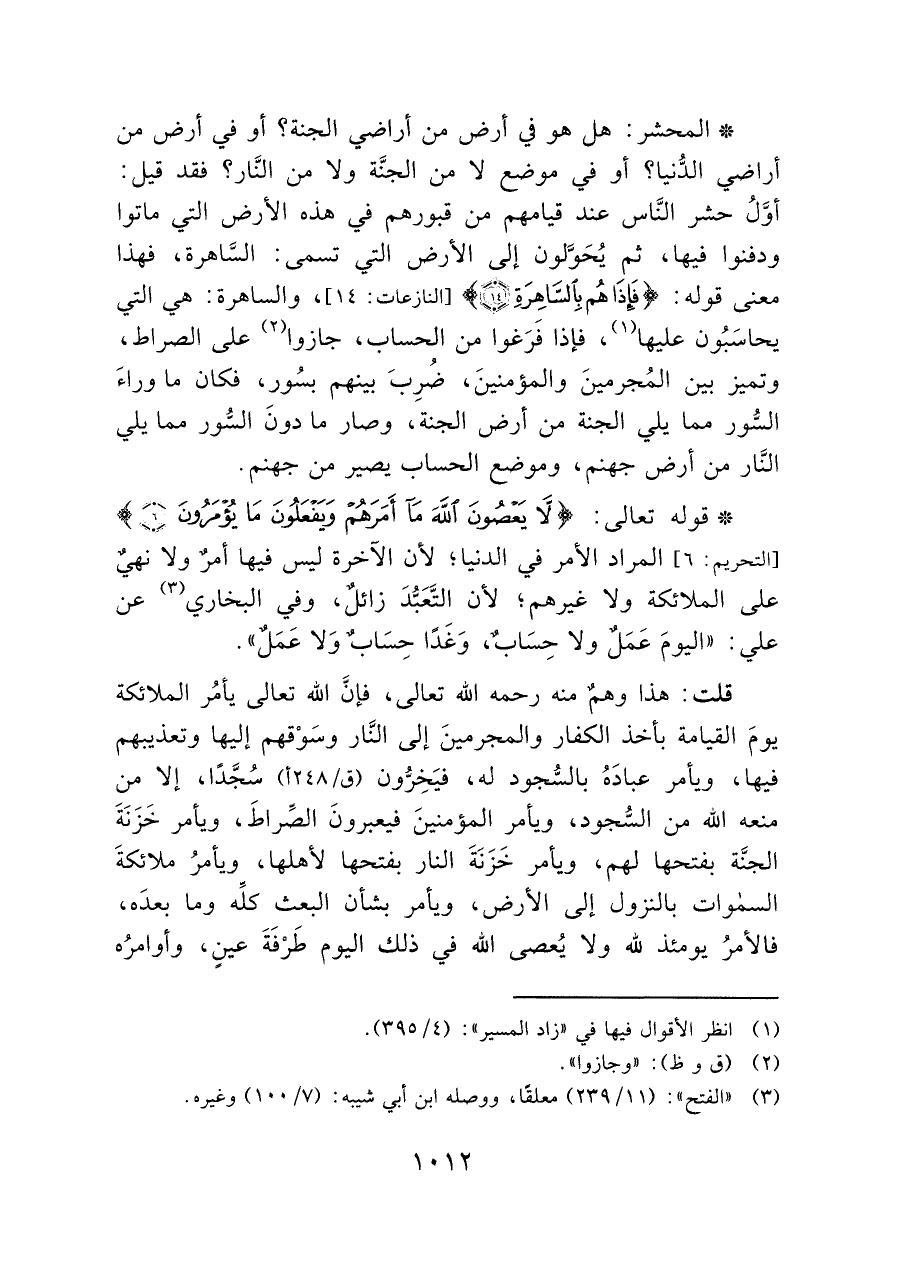 * المحشر : هل هو في أرض من أراضي الجنة؟ أو في أرض من أراضي الدُّنيا؛ أوفي موضع لا من الجنَّة ولا من النَّار؟ فقد قيل: أوَّلُ حشر النَّاس عند قيامهم من قبورهم في هذه الأرض التي ماتوا ودفنوا فيها، ثم يُحَوَّلون إلى الأرض التي تسمى: السَّاهرة، فهذا معنى قوله: {فَإِذَا هُمْ بِالسَّاهِرَةِ (١٤)} [النازعات: ١٤]، والسَّاهرة: هي التي يحاسَبُون عليها (¬١)، فإذا فَرَغوا من الحساب، جازوا (¬٢) على الصراط، وتميز بين المُجرمينَ والمؤمنينَ، ضُرِبَ بينهم بسُور، فكان ما وراءَ السُّور مما يلي الجنة: من أرض الجنة، وصار ما دونَ السُّور مما يلي النَّار من أرض جهنم، وموضع الحساب يصير من جهنم.